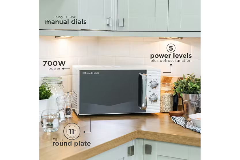 The Russell Hobbs Inspire 17L 700W Freestanding Microwave in White is a stylish and functional addition to any kitchen. With its unique textured casing and sleek mirrored finish, this microwave offers 700 watts of power for quick and convenient cooking. The 24.5cm glass turntable is dishwasher safe for easy cleaning, and the five power levels and defrost setting provide complete cooking control. With a 30-minute timer and non-slip feet for added stability, this microwave is the perfect everyday appliance for busy households.