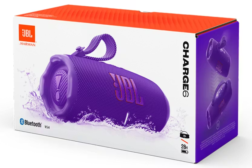 Introducing the JBL Charge 6 Portable Bluetooth Speaker in Purple, the ultimate audio companion for music lovers on the go. With powerful JBL Pro Sound enhanced by AI Sound Boost technology, up to 28 hours of playtime, and the ability to connect multiple speakers for a larger sound stage, the Charge 6 delivers immersive sound quality in a durable, waterproof, and drop-proof design. Plus, with features like fast charging, a built-in powerbank, and lossless audio playback, this speaker is a must-have for those who demand superior audio performance wherever they go. Elevate your listening experience with the JBL Charge 6. Experience the next level of portable audio with the JBL Charge 6 Portable Bluetooth Speaker in Purple. With its sturdy handle strap, fast charging capabilities, and multi-speaker connection options, this speaker is designed to keep the music playing no matter where you are. Enjoy lossless audio playback, waterproof and dustproof construction, and up to 24 hours of playtime with an additional 4 hours with Playtime Boost. The JBL Charge 6 is not just a speaker, it's a statement of superior sound quality and durability for those who refuse to compromise on their music experience.