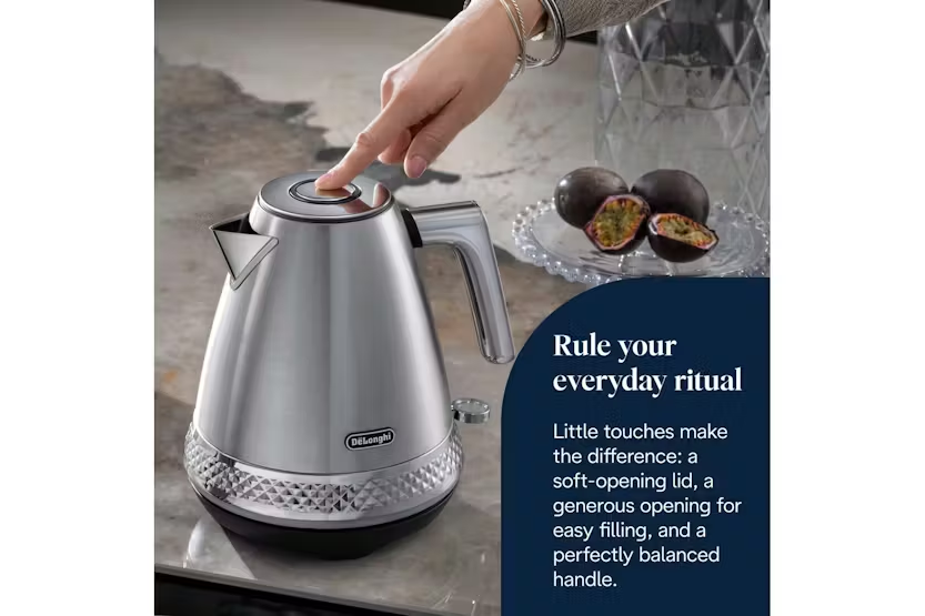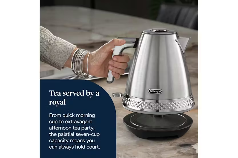 Description Diadema Daily routines turned into luxurious experiences: breakfast or any break during the day becomes an unforgettable moment with Diadema. The collection distils preciousness and is a precise statement thanks to its sumptuous aesthetics. One Touch Flip LID The one touch lid allows you to open the kettle with the simple touch of a finger. The spout is engineered for a streamlined pour of water with zero splashing. Cordless Kettle Cordless kettle for maximum freedom to use: it can be placed on the independent base in any position (360°). Non-slip feet. Assured Water Purity and Perfect Pouring The removable and washable limescale filter ensures water purity. The spout is designed to ensure perfect, splash-free pouring. Fast and Efficient Boiling Powerful concealed heating element to rapidly bring water to boil. The built-in water level indicaor ensures you boil just what you need – minim fill capacity: one cup (0,5L). Product Features: Precious brushed finishing with chromed details Premium metal coined band 360° on/off light One touch flip opening lid Detachable base for cord-free convenience 3-level safety protection Auto shut-off when water reaches the temperature Auto shut-off when body is lifted from base Removable, washable anti-scale filter
