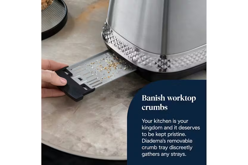 Description Turn your daily routines into luxury experiences with the Diadema breakfast collection. The perfect mix of style and functionality, this timeless Platinum-coloured long-slot toaster is masterfully modelled to add an elegant touch to your kitchen, with an array of settings, adjustable progressive browning controls and long slots to fit any slice. Browning Controls Create breakfast treats to everyone’s individual preferences with electronic pre-set toasting functions,including defrost,reheat,bagel and cancel,with progressive browning controls. Crumb Tray Convenient cleaning thanks to the fully removable crumb tray,preventing breadcrumbs from building up in the toaster and keeping your worktop neat and tidy. Extra-Lift Position Raise up and remove smaller slices easily using the toaster's practical extra-lift position. Product Features Toast to your tastes with progressive browning, reheat, bagel and defrost settings Fit a wider variety of baked goods with long toaster slots Easily remove small slices using the extra-lift position Keep your worktops tidy thanks to the removable crumb tray Elegantly designed kettle in striking Onyx Black Finishing: Glossy Control method: Button