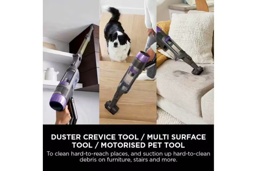 Description Check out the video: PowerDetect Intelligence Enjoy smart, fast, efficient cleaning with PowerDetect Intelligence, which boosts power by up to 75%* to increase cleaning. DuoClean Detect: Two brush-rolls and multiple sensors react and adapt for optimal performance. DirectionDetect: Designed to work in both forward AND reverse for faster**, more efficient cleaning. DirtDetect: Automatically detects dirt and boosts cleaning power. EdgeDetect: Senses edges & corners and increases suction. FloorDetect: Senses floor type and adjusts brush-roll speed and suction Empties & Charges After Every Clean Always ready, always charged. The Auto-Empty Base automatically empties and charges the vacuum while docked, so itās always ready for the next clean. No more manual emptying after every cleanā the Auto-Empty base holds dirt and debris for up to 45 days, so you can forget about emptying it for weeks at a time. The base locks away fine dust, debris, allergens and odours after every clean. Anti-Allergen Complete Seal Technology captures and traps 99.9%* of dust and allergens inside the base, while Anti-Odour Technology guards against bad odours. * Based on IEC standard 62885-2 Cl. 5.14 at 0.3 to 10 microns. Anti Hair Wrap Plus for powerful hair pickup Anti Hair Wrap Plus provides powerful hair pickup and anti-hair wrap performanceāremoving hair as you clean with specially engineered bristles. A chevron pattern directs debris and pulls hair to the centre of the floorhead to be removed by the anti-wrap combs, providing powerful hair pickup that removes hair as you clean. Perfect for long, short and pet hair. Powerful Handheld Vacuum with 3 Accessories The Shark PowerDetect Clean & Empty gives you fast, versatile cleaning, transforming into a handheld vacuum with 3 specialised tools: a Duster Crevice Tool for hard-to-reach edges and corners, a Motorised Pet Tool ideal for furniture, and a Multi-Surface Tool perfect for hard surfaces and hard floor stairs. Experience Shark's best* cleaning cordless vacuum with new reverse clean technology, and Shark's most powerful cordless suction DuoClean Detect: Two brush-rolls and multiple sensors react and adapt for optimal performance. DirectionDetect: Designed to work in both forward AND reverse for faster, more efficient cleaning. DirtDetect: Automatically detects dirt and boosts cleaning power. EdgeDetect: Senses edges & corners and increases suction. FloorDetect: Senses floor type and adjusts brush-roll speed and suction. The Shark PowerDetect Clean & Empty is a powerful, intelligent, deep-cleaning cordless vacuum that charges and empties after every clean ā locking away dirt and debris for up to 45 days. Enjoy smart, fast, efficient cleaning with PowerDetect Intelligence, which boosts power by up to 75%*** to increase cleaning: Reverse Clean Technology: Many cordless vacuums only pick up debris efficiently when you push them forward. With a patent-pending fin design, the DuoClean Detect floorhead was designed to work in both forward AND reverse, so now you can enjoy a fast, efficient clean. Always ready, always charged: The Auto-Empty Base automatically empties and charges the vacuum while docked, so itās always ready for the next clean. No more manual emptying after every cleanā the Auto-Empty base holds dirt and debris for up to 45 days, so you can forget about emptying it for weeks at a time. Locks away dust & debris: The base seals away fine dust, debris, allergens and odours after every clean. Anti-Allergen Complete Seal Technology captures and traps 99.9%***** of dust and allergens inside the base, while Anti-Odour Technology guards against bad odours. Anti Hair Wrap Plus provides powerful hair pickup and anti-hair wrap performance-removing hair as you clean with specially engineered bristles. A chevron pattern directs debris and pulls hair to the centre of the floorhead to be removed by the anti-wrap combs, providing powerful hair pickup that removes hair as you clean. Perfect for long, short and pet hair. Technology at your fingertips: An LED display provides real-time readouts showing Dirt Detection and Battery Status. Mode Type enables you to select between ECO, DETECT, and BOOST mode, giving you complete cleaning control. Plus, with a runtime of up to 70 minutesā , this self-empty vacuum can manage even the most marathon cleaning sessions. Raise your cleaning game: Shark PowerDetect Technology isnāt just focused on your floors. By cleverly converting to a handheld vacuum, itās perfect for cleaning stairs and furnishings. Complete with a Duster Crevice tool, Multi-Surface Tool, and Motorised Pet Tool, you can deep clean the whole house ā top to bottom. Itās all within your reach: Flexology allows you to bend the wand to easily clean under furniture, or fold it over for compact, freestanding storage. Clean with confidence: Shark offers a free 5-year guarantee for your peace of mind (upon registration with Shark, 2 years for batteries, UK & ROI only). For T&Cs, see Shark Guarantee Terms & Conditions. p> *Based on average performance when empty, across IEC 62885-2, Clauses 5.1, 5.2, 5.4, and 5.3, 5.5 in forward and backward starting directions. p> Measured at the hand vacuum, tested in Boost mode ***Boost mode vs ECO mode Product Features: Product Weight:3.71kg (Vacuum Only)