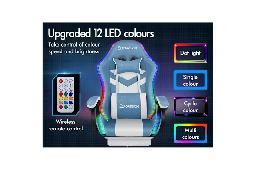 Description Online Only - Free Delivery ELFORDSON LED & Massage Gaming Chair Fabric Collection LED chairs are cool gaming chairs that can help you stand out from the gaming crowd. Elfordson supreme LED & massage gaming office chair is born for serious gamer, and the smart working executive who loves the adrenaline of residing in a gaming chair. Elfordson all-metal frame racer chair is the ultimate for movers and shakers like yourself. Crafted with innovation in mind, we upgraded the gaming chair with 12 colours of LED and 8 massage points (while old models only equips with 7 LED & 7 massage points), making the gaming experience more comfortable and enjoyable. That means aside from looking good with more terrific customisable LED lighting effect, the chair also provides a better massage while enjoying your favorite game. Furthermore, its ergonomic S-curve design with detachable and height-adjustable lumbar and neck cushions offers perfect support to make you relaxed, allowing you to work or play at your peak for long periods of time in optimal comfort. Combined with retractable padded footrest that suits your personalized positions while sitting, sleeping or playing games. An elite in quality and design, your solution to true comfort. It features 150 degree back recline adjustment and 360 degree swivel, you can lock the position of reclination as you wish. Upholstery crafted with premium linen fabric and generous foam paddings ensures optimal durability and easy cleaning. A stylish nylon base with TUV certified casters, Intertek approved linen fabric, SGS approved Gas-Lift system and tilt function, delivering absolute five star luxury. And unlike some other sellers, we have no compromise on materials used. We guarantee that no cycled foams are used, no backrest is cut short or narrow to save money, and no seat foam is cut thin to save cost. The Elfordson range is available in multiple colours and designs, browse Elfordson store and choose one that best suits you or your room. Take the stress out of work and experience superior comfort at your desk - order your Elfordson gaming office chair today! Specifications Intertek approved supreme linen fabric SGS approved gas-lift, no worries about explosion TUV approved caster wheels Triple-layer seat: linen fabric + resilience foam + robust wooden board High weight capacity: 180kg Colour: Blue & White What's in the Box: 1 x Elfordson office chair 1 x Assembly manual Product Features: Customisable 12 colours RGB LED light You can customize light emitting area: backrest only or backrest & seat 300 lighting effects with remote control 8-point massage & 5 massage modes with massage controller Upgraded slide rail armrests Heavy-duty all-metal frame racer Dynamic ergonomics design, best fit for your body Removable and height-adjustable head & lumbar cushions Extra large lumbar pillow for better support! No compromise on materials, we don't use recycled foam Generous foam paddings, we don't cut it thin to save money Up to 150 degree back recline adjustment Able to lock the reclination position Wider & taller backrest, we don't cut it short to save cost Retractable padded footrest Premium universal wheels, a smoothy experience Deluxe tilt adjustment Whole-piece moulding foam, better weight distribution and support Smoothly 360 degree swivel Deluxe PP plastic armrests with padding, wide and supportive High resilience foam in car-seat grade Eliminates back and shoulder pressure Sporty nylon base with a touch of matching colour Ideal for gamer and business uses