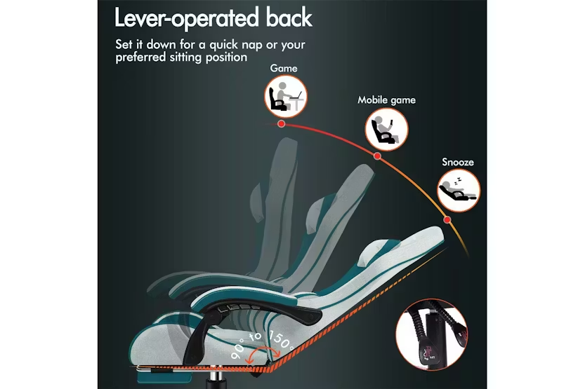 Description Online Only - Free Delivery Multiple Uses Choose Elfordson, the Best Resolution Ergonomically Designed Thor Series 2-point Lumbar Massage 150° Backrest Recliner Dynamic Ergonomics Reinforced Steel Base SGS-safe Gas Lift Nylon Base with Quality Wheels Integrated 2- Point Massage Enjoy soothing. This high back gaming chair provides USB-powered vibration massage in adjustable & removable lumbar cushion, it helps alleviate back tension, enhancing comfort during gaming, work, or study sessions. Posture-Perfect & Cool Comfort This ergonomic computer PC chair features an engineered frame aligned with your spine's natural curve, personalising your comfort with adjustable headrest and lumbar support. The generous seat is padded with high resilience foam, providing excellent body support while reducing pressure points on hips and thighs during extended use. Breathable fabric linen ensures optimal airflow. Flexible As you Need With 10cm of height adjustment, this gaming chair comfortably accommodates children, teenagers, and adults. The linkage armrests move along with the reclining backrest (90°-150°), ensuring continuous arm support whether gaming, working, or resting. Retractable footrest enhances relaxation, while 360° swivel and multi-directional silent casters enable smooth movement. This PC chair allows you to move effortlessly at home, office, or e-sports playroom. Vibrant & Premium 6 colour options available for various decoration styles. Crafted with TUV-certified casters, solid streamlined nylon base, and an SGS-approved gas lift mechanism with over 120,000 tests. This computer desk chair accommodates users up to 180kg (400 lb), deliverig ultra stability and safety. Product Features Frame material: Engineered wood Back style: Cushion back Adjustable lumbar Adjustable height Arm rest Ergonomic Head support Read More
