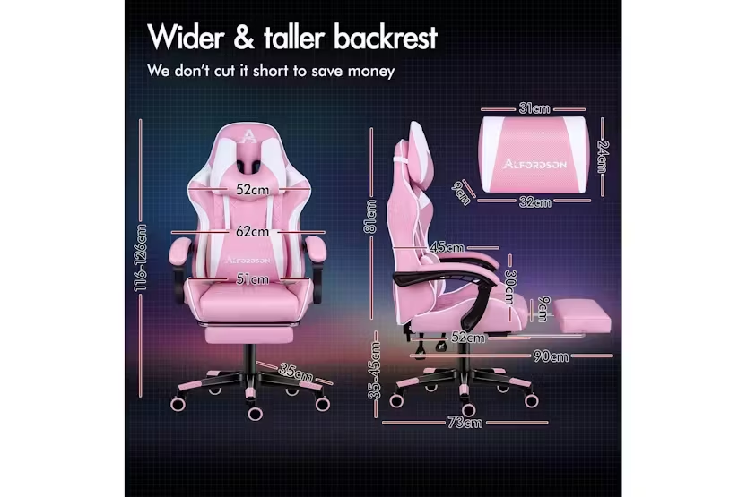 Description ONLINE ONLY Alfordson Gaming Chair | High-Back Faux Leather | Pink Upgrade your gaming and work experience with the Alfordson Gaming Chair, designed for those who demand comfort, durability, and style. Whether you are a dedicated gamer, a busy professional, or someone who spends long hours at the desk, this high-back gaming chair delivers the ultimate in ergonomic support and luxury. Finished in a striking pink faux leather, it is the perfect addition to any modern Irish home office or gaming setup. Engineered with a heavy-duty all-metal frame, the Alfordson Gaming Chair offers exceptional stability and longevity. The S-curve design and extra-wide, taller backrest are tailored to fit your body, eliminating back and shoulder pressure during long sessions. The whole-piece moulding foam padding in the car-seat grade base seat ensures ultra comfort, while the triple-layer seat construction combines premium PU leather and resilience foam for lasting support. Enjoy personalised comfort with up to 150-degree back recline adjustment, allowing you to find the perfect position for gaming, working, or even taking a quick nap. The removable, height-adjustable extra-large lumbar pillow and U-shape headrest provide superior support, reducing fatigue and promoting healthy posture. For moments of relaxation, simply extend the retractable padded footrest and unwind in style. Designed for versatility, this chair is ideal as a gaming chair, office chair, computer chair, or executive chair. The deluxe PP plastic armrests with padding offer wide, supportive comfort, while the sporty nylon base adds a touch of colour and resists dirt. Premium universal wheels and a smooth 360-degree swivel ensure effortless movement across any surface, making it easy to transition between tasks. With a high weight capacity of up to 180kg, the Alfordson Gaming Chair is built to accommodate a wide range of users. The Intertek supreme PU leather is both stylish and easy to clean, while the SGS gas-lift and TUV caster wheels guarantee safety and reliability. Make a statement in your workspace or gaming room with this eye-catching pink chair that combines performance, comfort, and flair. Key Features: Heavy-duty all-metal frame for enhanced durability Ergonomic S-curve design with wider and taller backrest Whole-piece moulding foam padding for superior comfort Up to 150-degree back recline adjustment Removable, height-adjustable extra-large lumbar pillow U-shape headrest for optimal neck support Retractable padded footrest for relaxation Deluxe padded armrests and sporty nylon base Premium universal wheels and 360-degree swivel High weight capacity: supports up to 180kg Stylish pink faux leather finish Specifications: Material: Intertek supreme PU leather, resilience foam Frame: All-metal Base: Sporty nylon Wheels: TUV caster wheels Gas-lift: SGS certified Colour: Pink Weight Capacity: 180kg Included Items: 1 x Alfordson Gaming Chair 1 x Assembly Manual