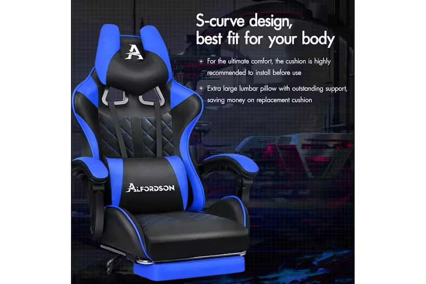 Description ONLINE ONLY -FREE DELIVERY Alfordson Gaming Chair | High-Back Faux Leather | Blue Upgrade your gaming and office experience with the Alfordson Gaming Chair, designed for those who demand comfort, durability, and style. Whether you are a dedicated gamer, a remote worker, or simply looking for a premium office chair, this high-back faux leather chair delivers the ultimate in ergonomic support and luxury. With its striking blue finish and sporty design, it is the perfect addition to any Irish home office or gaming setup. Engineered for long hours of use, the Alfordson Gaming Chair features a heavy-duty all-metal frame for enhanced durability and stability. The S-curve, wider and taller backrest is expertly contoured to fit your body, helping to eliminate back and shoulder pressure during intense gaming sessions or extended workdays. The generous, high-resilience moulding foam padding in the car-seat grade base seat ensures you stay comfortable, no matter how long you sit. Enjoy personalised comfort with up to 150-degree back recline adjustment, allowing you to find the perfect position for gaming, working, or even taking a quick nap. The removable and height-adjustable extra-large lumbar pillow and U-shape headrest provide superior support, reducing fatigue and promoting healthy posture. For added relaxation, the retractable padded footrest is ideal for stretching out and unwinding between tasks. Designed for smooth movement, the Alfordson Gaming Chair is equipped with premium universal wheels and a 360-degree swivel, making it easy to move around your workspace. The deluxe PP plastic armrests with padding offer wide, supportive comfort, while the sporty nylon base adds a touch of colour and resists dirt better than standard plastic bases. This chair is versatile enough to serve as a gaming chair, office chair, computer chair, or executive chair, making it a smart investment for any Irish household. Key Features: Heavy-duty all-metal frame for long-lasting durability Ergonomic S-curve, wider and taller backrest for optimal support High-resilience, whole-piece moulding foam padding for superior comfort Up to 150-degree back recline adjustment for personalised seating Removable, height-adjustable extra-large lumbar pillow and U-shape headrest Retractable padded footrest for added relaxation Premium universal wheels and smooth 360-degree swivel Deluxe padded armrests and sporty, easy-to-clean nylon base Versatile use: gaming, office, computer, or executive chair Specifications: Material: Intertek supreme PU leather Seat: Triple-layer (PU leather + resilience foam) Frame: All-metal construction Gas-lift: SGS certified Wheels: TUV caster wheels Weight Capacity: Up to 180kg Colour: Blue Included Items: 1 x Alfordson Gaming Chair 1 x Assembly Manual Transform your workspace or gaming area with the Alfordson Gaming Chair. Combining ergonomic design, premium materials, and versatile functionality, it is the ideal choice for Irish gamers and professionals seeking comfort and style in one impressive package.