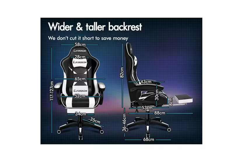 Description ONLINE ONLY Product Description Elfordson Gaming Chair - Xavier Collection Specially designed for serious gamer and smart working executive who loves the adrenaline of residing in a gaming chair, the Elfordson gaming chair in Xavier collection is the ultimate for movers and shakers like yourself. Built with premium PU leather, generous foam paddings and ergonomically-friendly design with detachable and height-adjustable lumbar and neck cushions, Elfordson racer chair provides your entire body with ample support in all the right places. The 2-point lumbar massage function allows you to work or play at your peak for long periods of time in optimal comfort. With an X pattern in the middle, the Xavier chair perfectly combines both comfort and style. The chair features 150 degree back recline adjustment and 360 degree swivel. You can lock the position of reclination as you wish. Combined with retractable padded footrest, it suits your personalized positions while sitting, sleeping or playing games. An elite in quality and design, your solution to true comfort. A stylish nylon base with TUV certified casters, Intertek approved PU leather, SGS approved Gas-Lift system and tilt function, delivering absolute five star luxury. And unlike some other sellers, we have no compromise on materials used. We guarantee that no cycled foams are used, no backrest is cut short or narrow to save money, and no seat foam is cut thin to save cost. The Elfordson range is available in multiple colours and designs, browse Elfordson store and choose one that best suits you or your room. Take the stress out of work and experience superior comfort at your desk - order your Elfordson gaming office chair today! Specifications Intertek approved supreme PU leather SGS approved gas-lift, no worries about explosion TUV approved caster wheels Triple-layer seat: PU leather + resilience foam + robust wooden board High weight capacity: 180kg What's in the Box: 1 x Elfordson office chair 1 x Assembly manual Product Features: Dynamic ergonomics design, best fit for your body Wider & taller backrest, we don't cut it short to save cost Enhanced lumbar pillow with massage function! 2-point massage & 5 massage modes Upgraded slide rail armrests Deluxe PP plastic armrests with padding, wide and supportive Removable and height-adjustable head & lumbar cushions Generous foam paddings, we don't cut it thin to save money High resilience foam in car-seat grade Whole-piece moulding foam, better weight distribution and support No compromise on materials, we don't use recycled foam Eliminates back and shoulder pressure Up to 150 degree back recline adjustment Able to lock the reclination position Retractable padded footrest Deluxe tilt adjustment Smoothly 360 degree swivel Premium universal wheels, a smooth experience Sporty nylon base with a touch of matching colour Ideal for gamer and business uses