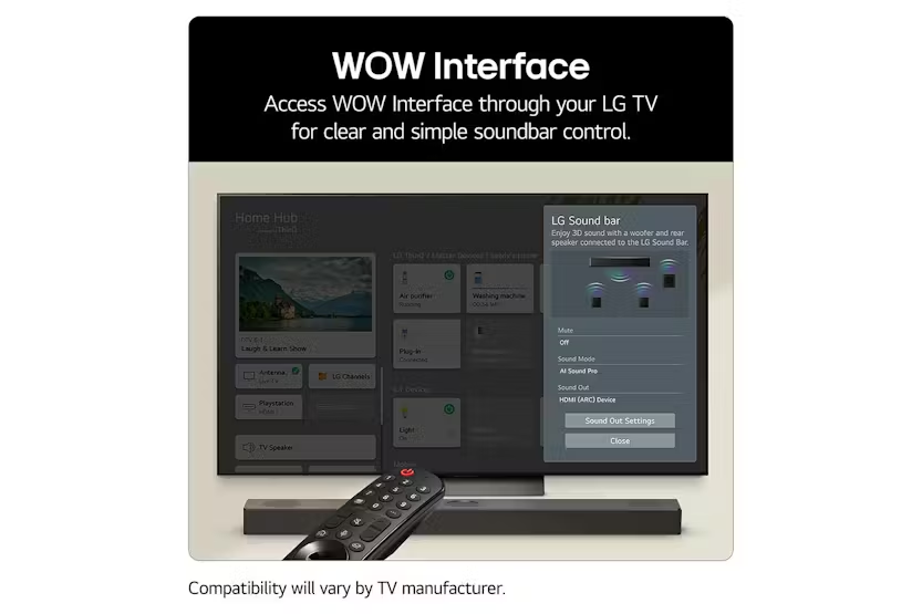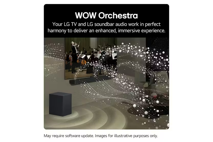 Description WOW Bracket Perfectly Matches Your LG OLED evo C Series and Soundbar Enjoy your LG OLED evo C series on the wall or on a stand with the WOW Bracket. Check out the video: *All Pictures shown are for illustration purpose only. WOW Bracket: Fits Neatly on LG OLED evo C Series An exclusive bracket allows you to place soundbar in the right position so that you can hear the LG's best sound. Both as a stand or wall-mounted, your soundbar creates optimal sound with a sleek design *Bracket compatible with LG OLED evo C2 / C3 / C4 Series 195cm/77â, 164cm/65â, 139cm/55â. WOW Orchestra: A soundbar that Works in Harmony with Your LG TV Sound LG soundbar presents perfect harmonious sound with LG TV. It uses both LG TV sound and LG soundbar at once for the ultimate listening experience. Feel every detail of sound. *Screen images simulated. **WOW Orchestra Compatible TVs: OLED M4/G4/C4/B4/Z3/M3/G3/C3/B3/A3/Z2/G2/C2/CS/B2/A2, QNED 99/95/90/85/80. Compatible TVs may vary by year of release. QNED 80 support limited to 2022 and 2023 models. ****WOW Orchestra may vary depending on soundbar model. WOW Interface: Control Soundbar from Your LG TV Interface Control your soundbar through LG TV with one remote. With one click of the remote, you can see the soundbarâs menu and settings on the TV screen. Such as volume control, checking the connection status, and even selecting a sound mode. WOWCAST: Connect Wirelessly to Your LG TV Enjoy content without wires. LG WOWCAST wirelessly connects LG soundbar* and LG TV to deliver high-quality sound more conveniently. Feel the power of dolby atmos for a more immersive audio experience. **WOWCAST Compatible TVs : OLED M4/G4/C4/B4/M3/G3/C3/B3/A3, QNED 99/95/90/85. Compatible TVs may vary by year of release. ****WOWCAST Ready may vary depending on soundbar model. Experience Theater Quality Sound LG soundbar combines with dolby atmos and DTS:X to bring theater-like sound to your living room. It surrounds you in clear and realistic sound from all sides, placing you in the center of your favorite movies for powerful, true-to-life sound with every scene. *Dolby and Dolby Vision are registered trademarks of Dolby Laboratories Licensing Corporation. **The double-D symbol is a trademark of Dolby Laboratories Licensing Corporation. Worldâs 1st Dolby Atmos soundbar with Triple Up-firing Channels Meet the worldâs first triple up-firing channels. It means that LG soundbar USC9S delivers a wider and richer soundstage. Enjoy the most immersive sound experience at home. Triple Level Spatial Sound Creates a Virtual Sound Dome LG soundbar USC9S pushes the boundary of the entertainment experience. Your soundbar presents triple level spatial soundâ a more immersive and accurate sound experience. By using an HRTF(Head Related Transfer Function) related 3D engine, your soundbar creates a virtual middle layer. It means that the sound layers realize sophisticated surround sound that you would only experience in theater. *âTriple Level Spatial Soundâ is available in CINEMA / AI Sound Pro Mode of soundbar. **The mid-layer is created using soundbar âs speaker channel. The sound of the front and front-top speakers are synthesized to build a sound field. ***If there is no rear speaker, the rear field cannot be created. Feel the Roar of the Bass Feel stronger, deeper bass in your favorite songs and movies. The wireless subwoofer hit low notes with ease, with increased volume, and bass quality transmitted over a longer distance. Exceptional Content Experience Connect your LG soundbar USC9S to a console or blu-ray player to immerse yourself in your favorite games, TV shows, and movies. Your soundbar offers a lag-free viewing experience with LG's best picture and sound. 4K Pass-through Keeps High Quality LG soundbar has a 4K pass-through. It transmits data without losing quality. So you can enjoy both stunning audio and video with minimal connections. *Both TV and soundbar must support VRR/ALLM. **Console has to support VRR. VRR pass though limited to 60Hz content. VRR/ALLM Enhances Game Play LG soundbar is made to offer the best gaming experience with VRR/ALLM. Variable refresh rate(VRR) up to 120Hz. Its nearly-instantaneous response time gives you an advantage for gaming and creating a realistic viewing experience. Auto low latency mode(ALLM) allows for smooth, lag-free viewing and interactivity. Enjoy HD Music Streaming Services Play music on your soundbar. LG soundbar is compatible with spotify and tidal connect. *Some features require 3rd party subscription or account. **Google is a trademark of Google LLC. *** The Google Assistant is not available in certain languages and countries. ****Amazon, Alexa, and all related marks are trademarks of Amazon.com, Inc. or its affiliates. Connect to the Platform You Use LG soundbar s have wider compatibility to work with Google, Alexa and Apple Airplay2. Control the LG soundbar with the platform of your choosing. Check out the video: Multi-channel Audio Experience that Exceed Expectations With LG soundbar USC9S, your content sounds better than before. It divides two-channel audio into multi-channel audio, optimizing what you hear. *Available on AI Sound Pro, Cinema, Clear Voice Pro, Sports, Game modes. Check out the video: Upgraded AI Room Calibration Pro Deliver the Most Optimal Sound LG soundbar considers the sound where it is in the space. With an upgraded AI room calibration, your soundbar delivers the optimal sound. By matching reference frequencies at an extended range of 400Hz, it can analyze the space precisely and correct the distortion of the sound. *AI Room Calibration Pro is a automatic sound tuning technology that compensates for the environment the soundbar is placed, by using Algorithms that improve the soundbar âs sonic performance. Check out the video: LG AI Sound Pro Optimizes Sound for Various Contents Enjoy your content with specialized sound modesâ AI sound Pro. It intelligently analyzes your content to deliver o