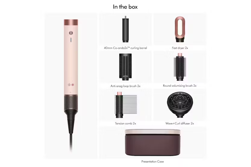 Description Next-level multi-styler with twice the air pressure for even more power! Better curling. Faster drying. Straighter styles .1 2x the air pressure with the Dyson Hyperdymium™ 2 motor. Dyson’s most powerful Airwrap™ multi-styler. New Intelligent attachments Each attachment automatically adjusts to your go-to styling preferences. Our lightest Airwrap™ multi-styler Lighter in hand, for improved control and manoeuvrability.. One-touch i.d. curl™ sequence With Bluetooth® wireless technology to intelligently adapt heat, airflow and timings to your hair type. Perfect curls at the touch of a button Create your i.d. curl™ personalised curling sequence in the MyDysonᵀᴹ app. 6-in-1 versatility Dry, curl, wave, straighten, smooth and volumise with our new Intelligent attachments. 40mm Co-anda2x™ curling barrel Increased Coanda airflow for easier styling. Over 80% said hair feels soft and looks healthy. Fast dryer 2x Controls higher velocity airflow, for full hair dryer performance. Round volumising brush 2x New tapered design allows the whole bristle to pivot, releasing hair easily as you style. AirSmooth2x™ attachment Straighter styles, no hot plates. 91% said hair looks healthy. 81% said hair is frizz free. Anti-snag loop brush 2x For a smoother, more aligned finish. Over 90% said hair is tangle-free, and bristles were comfortable. Key controls Power and Cold shot buttons Press the Power button to activate airflow, initiate automatic features and turn off the device. Hold the Cold shot button to deactivate the heating element and set your style. Airflow speed and temperature control For each attachment, you can change the heat and airflow from the preset setting, to suit your needs. The device remembers and intelligently adjusts to your go-to styling settings. In the box: New Dyson Airwrap Co-anda2x™ multi-styler and dryer - Straight+Wavy (Ceramic pink/Rose gold) 30mm Co-anda2x™ curling barrel 40mm Co-anda2x™ curling barrel AirSmooth2x™ attachment Anti-snag loop brush 2x Round volumising brush 2x Fast dryer 2x