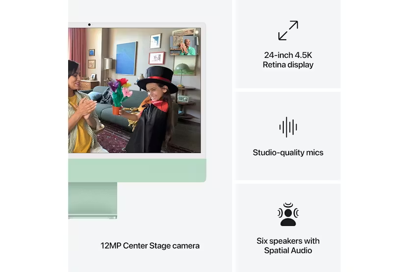 Description Key Feature Bullets (with Apple Intelligence) Fits Perfectly in Your Space The all-in-one desktop design is strikingly thin, comes in seven vibrant colours and elevates any space with style. Built for Apple Intelligence [1] Apple Intelligence is the personal intelligence system that helps you write, express yourself and get things done effortlessly. With groundbreaking privacy protections, it gives you peace of mind that no one else can access your data - not even Apple. Supercharged by M4 Get more done faster with the Apple M4 chip. From editing photos to creating presentations to gaming, you’ll fly through work and play. Immersive Display The 24-inch 4.5K Retina display [2] features 500 nits of brightness and supports up to one billion colours. Advanced Camera and Audio Stay perfectly framed and sound great with a 12MP Center Stage camera, three studio-quality mics and six speakers with Spatial Audio. Apps Fly with Apple Silicon [3] All your favourites, including Microsoft Excel, Adobe Photoshop and Zoom, run lightning fast in macOS. If You Love iPhone, You’ll Love Mac Mac works like magic with your other Apple devices. Copy something on iPhone and paste it on Mac. Send texts with Messages or use your Mac to make and answer FaceTime calls. [4] Connect it All iMac features up to four Thunderbolt 4 ports — expanding your accessory options and enabling lightning-fast data transfers. Connect up to two external 6K displays for a vast canvas to view your work. And enjoy seamless connectivity with Wi-Fi 6E and Bluetooth 5.3. [5] Privacy and Security are Built Right in Every Mac comes with robust defences against viruses and malware. If your Mac is lost or stolen, Find My can help you get it back. FileVault makes sure your files are encrypted so others cannot access them. And free security updates help keep your Mac protected. Legal (with Apple Intelligence) Configurable options are available. iMac colour availability may vary. Nano-texture availability may vary. 1. Apple Intelligence is available in beta on all Mac models with M1 and later, with Siri and device language set to US English, as a macOS Sequoia update. English (Australia, Canada, New Zealand, South Africa, UK) language support available this December. Some features and support for additional languages, like Chinese, English (India, Singapore), French, German, Italian, Japanese, Korean, Portuguese, Spanish, Vietnamese and others, will be coming over the course of the next year. 2. Actual diagonal screen size is 23.5 inches. 3. Apps are available on the App Store. Software and content may be sold separately. Title availability is subject to change. 4. FaceTime is not available in all countries or regions. 5. Wi‑Fi 6E available in countries and regions where supported. Technical Specifications Go to apple.com/ie/imac for a complete set.