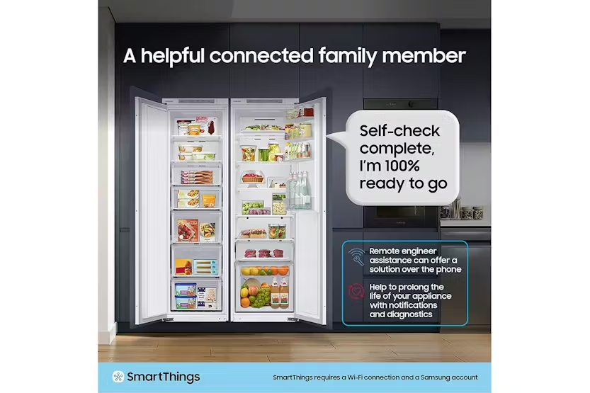 Upgrade your kitchen with the Samsung Series 6 Integrated Fridge Freezer featuring SpaceMax technology for extra storage space. Enjoy smart energy savings with AI Energy Mode, reducing energy use by up to 10%. Keep your food fresh with All-Around Cooling and easily monitor and manage your appliance with SmartThings Energy and SmartThings Home Care. With features like Power Freeze, No Frost, and gentle lighting, this fridge freezer offers convenience and efficiency for a smarter way to store and use food. Take advantage of the sleek design and advanced technology of the Samsung BRB70F26DES0EU fridge freezer, offering ample storage space, energy savings, and smart management features to simplify your kitchen experience. With SpaceMax technology, AI Energy Mode, and SmartThings app compatibility, this fridge freezer provides optimal cooling, energy efficiency, and convenience. Say goodbye to defrosting with Total No Frost and enjoy the ease of Power Freeze for rapid freezing. Upgrade your kitchen with this innovative appliance for a more efficient and organized food storage solution.