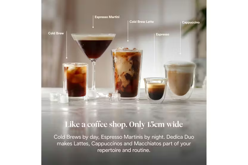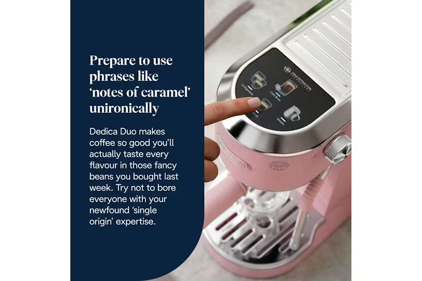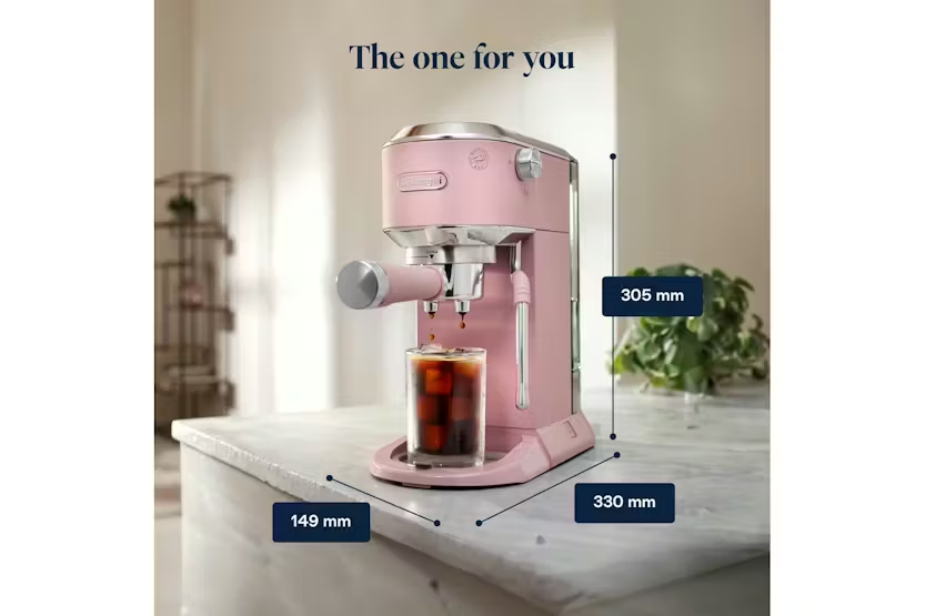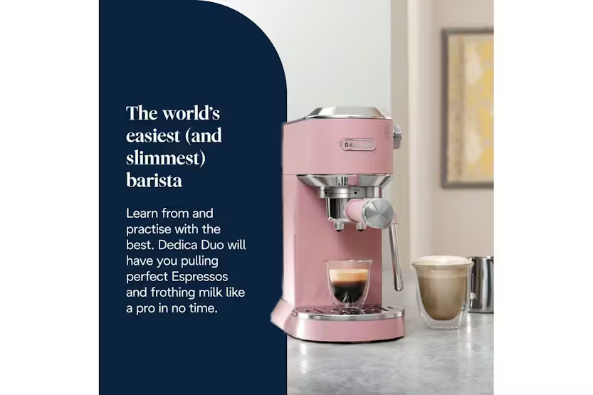 Elevate your coffee experience with the Delonghi Dedica Duo Coffee Machine in Pink. This compact yet powerful espresso machine allows you to create pro-style espressos, froth milk like a barista, and brew refreshing Cold Brew in just five minutes. With its intuitive digital display, customizable drink options, and sleek Italian design, you can enjoy delicious coffee crafted to your exact preferences every time. Upgrade your coffee game and become a Proper Coffee Person with the Dedica Duo. Experience the luxury of high-quality coffee at home with the Delonghi Dedica Duo Coffee Machine. From perfectly textured microfoam to customizable drink options, this espresso machine offers a barista-like experience in a compact design. With its ability to brew Cold Brew in minutes and its elegant Italian style, the Dedica Duo is the perfect addition to any coffee lover's kitchen.