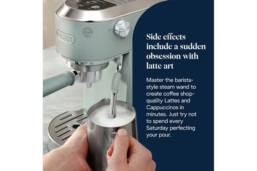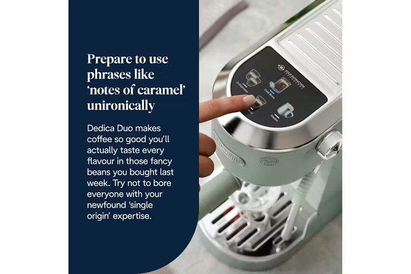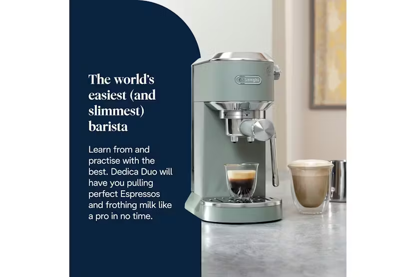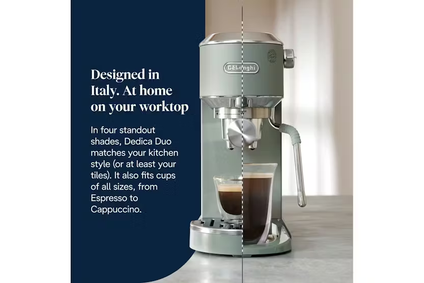 Experience the luxury of Italian espresso right in your own kitchen with the De'Longhi Dedica Duo Espresso Coffee Machine in a stylish green finish. This compact yet powerful machine offers high performance with 15 bar pressure, customizable drink options, and the ability to create perfect microfoam with the My LatteArt steam wand. Enjoy hot or cold coffee, including the exclusive Cold Brew recipe, and elevate your at-home coffee experience with this sleek and modern espresso machine. Master the art of crafting delicious coffee drinks with the Dedica Duo's intuitive digital display and adjustable drip tray, allowing you to use your favorite mugs or glasses up to 12 cm tall. The machine comes with three preset recipes - Espresso, Double Espresso, and Cold Brew - giving you the flexibility to enjoy your coffee just the way you like it. Elevate your coffee game with the De'Longhi Dedica Duo Espresso Coffee Machine and bring a touch of Italian elegance to your kitchen.