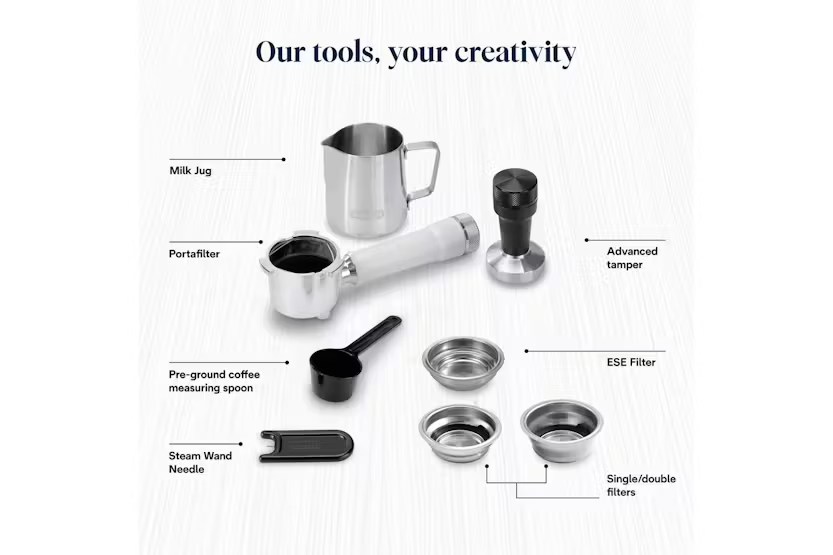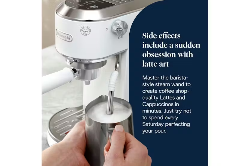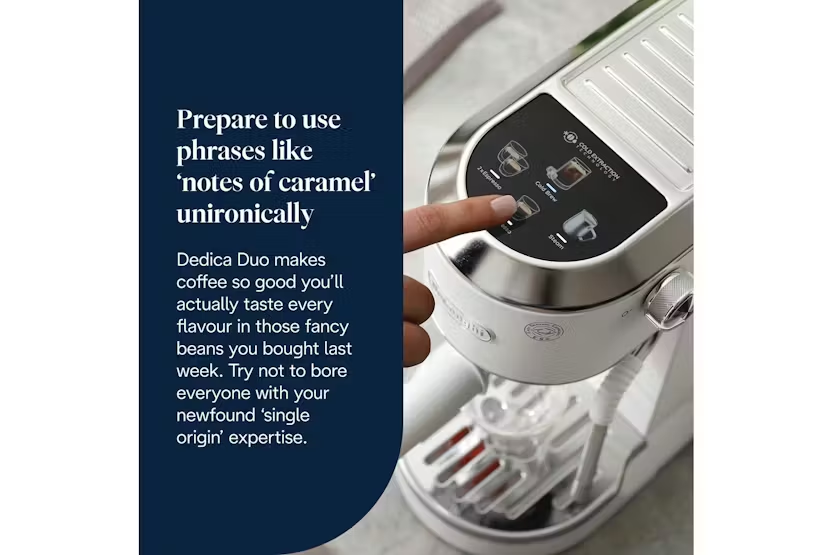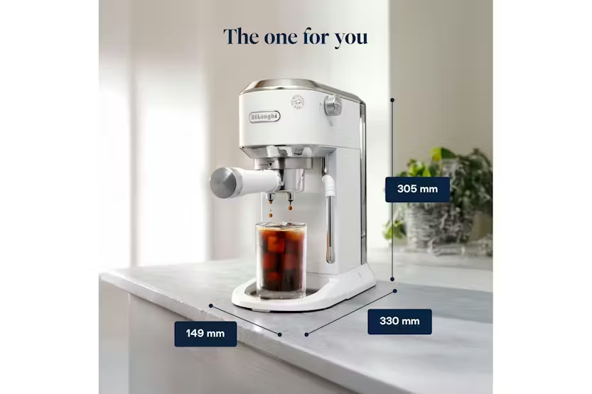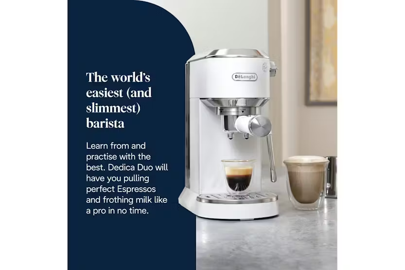 Experience the ultimate convenience and versatility with the De'Longhi Dedica Duo Espresso Coffee Machine in White. This compact yet powerful machine allows you to create a wide range of coffee and milk-based drinks, including the exclusive Cold Brew recipe, with ease. The My LatteArt steam wand ensures perfect microfoam for a professional touch, while the sleek Italian design adds a touch of elegance to your kitchen. With three preset recipes and intuitive digital display, crafting your favorite beverages has never been easier. Elevate your coffee experience at home with the Dedica Duo. Bring the taste of Italy into your home with the De'Longhi Dedica Duo Espresso Coffee Machine in White. Whether you prefer a classic Espresso, a creamy Cappuccino, or a refreshing Cold Brew, this machine delivers high-quality results every time. The compact design fits seamlessly into any space, while the My LatteArt steam wand allows you to create silky microfoam for a barista-quality finish. With adjustable cup height and a range of features for personalization, the Dedica Duo offers a customizable and convenient coffee experience for every coffee lover.