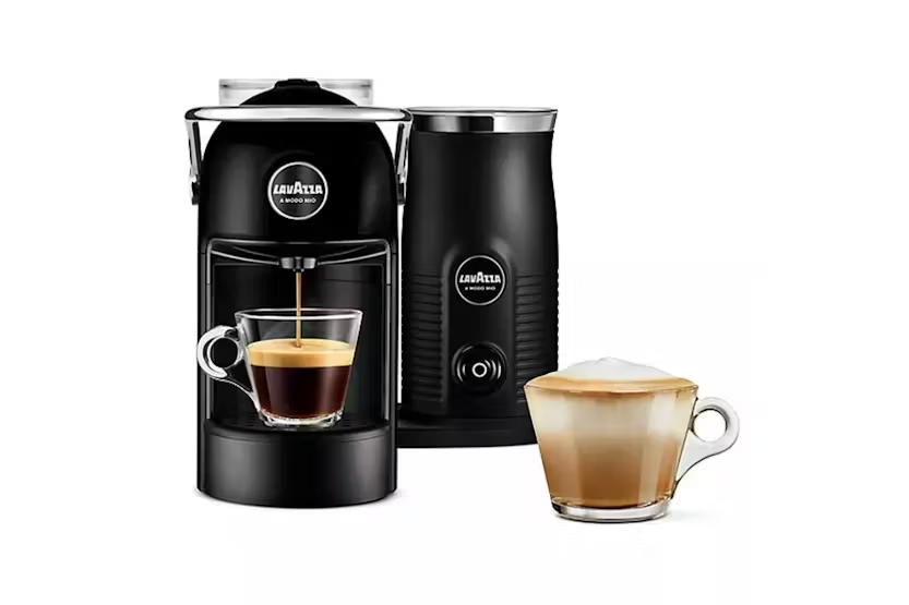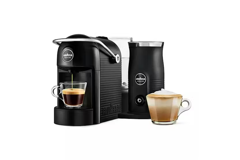Experience the authentic taste of Italian espresso and cappuccino with the Lavazza a Modo Mio Jolie & Milk Coffee Machine in sleek black. This elegant and quiet machine allows you to easily create a variety of coffee recipes using fresh milk, with features such as a quick 35-second heat-up time, automatic shut-off, and the ability to make espresso, long espresso, cappuccino, and latte macchiato. With an alert for an empty water tank and a drawer that can hold up to 5 used caps, this machine combines convenience and style for a premium coffee experience at home.
