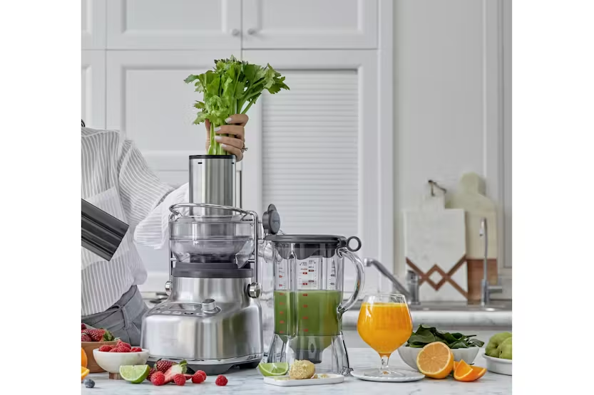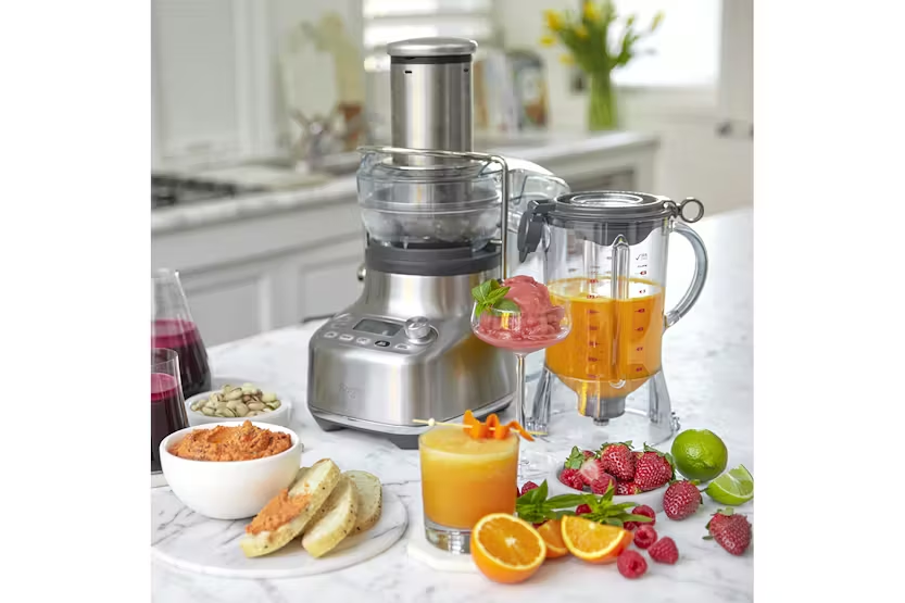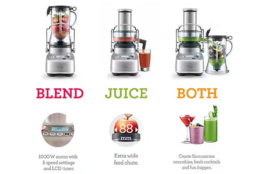 Experience the ultimate blending and juicing versatility with the Sage 3X Bluicer Pro Blender in sleek brushed stainless steel. This high performance appliance features Cold Spin Technology, 5 one touch programs, and 10 speed controls for extracting fresh juice directly into a 1.5L blender jug. With the ability to blend, juice, or combine both, you can create a wide range of delicious and healthy drinks with maximum freshness and flavor. The space-saving design of the 3X Bluicer Pro allows you to save counter space with one base for interchangeable actions. The extra wide 88mm feed chute makes juicing whole fruits and vegetables a breeze, while the built-in pulp bin and Cold Spin Technology ensure minimal temperature increase for optimal juice extraction. Elevate your blending and juicing experience with the Sage 3X Bluicer Pro and enjoy more flavors, more variety, and more fun in every drink.