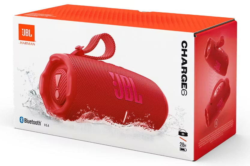 Experience powerful JBL Pro Sound with the JBL Charge 6 Portable Bluetooth Speaker in Red. With up to 28 hours of playtime, waterproof and drop-proof design, and AI Sound Boost technology, this speaker delivers immersive sound quality and durability wherever you go. Plus, with multi-speaker connection capability, fast charging, and a built-in powerbank, the JBL Charge 6 is the ultimate portable audio solution for music lovers on the move. Elevate your listening experience with the JBL Charge 6 today.