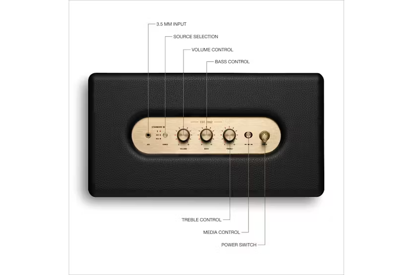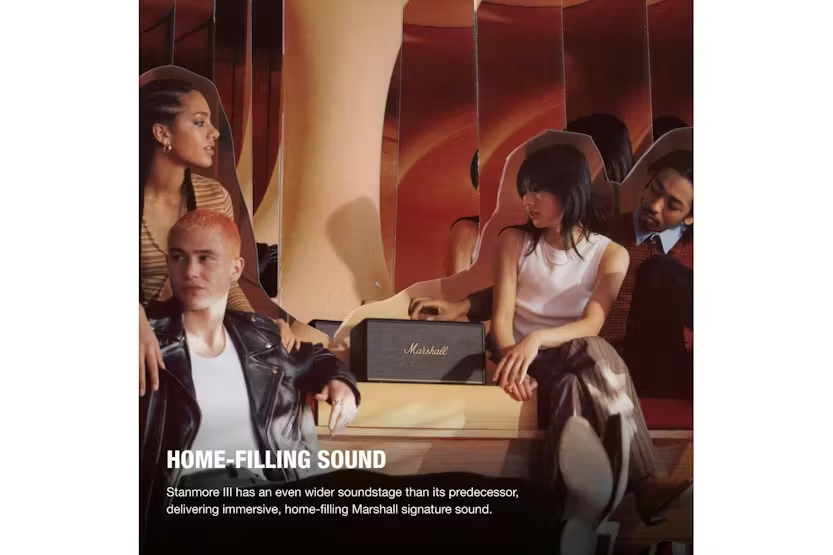 Experience the ultimate in wireless sound technology with the Marshall Stanmore III Bluetooth speaker in sleek Black. Boasting a two-way driver system and outward-angled tweeters, this speaker delivers a perfect balance of bass and treble for an immersive listening experience. With its sustainable design using recycled plastic and vegan materials, the Stanmore III is not only stylish but also environmentally friendly. Get ready to rock your world with the future of wireless sound. Upgrade your audio setup with the Marshall Stanmore III Bluetooth speaker in Black. With its expansive soundstage and modern Bluetooth technology, this speaker delivers a high-quality audio experience. Made with sustainable materials and available in a timeless design, the Stanmore III is not only stylish but also eco-friendly. Say goodbye to complex setups and hello to effortless connectivity with this powerful and versatile speaker.