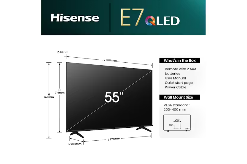 Experience unparalleled picture quality and immersive sound with the Hisense 55" E7 Pro 4K QLED HDR 144HZ Smart TV. Featuring Quantum Dot Colour technology and Dolby Vision&Atmos, this TV brings your entertainment to life with rich, vivid colors and stunning visuals. The AI Sports Mode automatically enhances visuals and audio for a stadium feel, ensuring you never miss a moment of the action. With the VIDAA Smart OS and AI Picture, enjoy seamless access to your favorite content and continuous, frame-level perfection for an exceptional viewing experience every time. Upgrade your home entertainment with the Hisense 55E71NQPR. Immerse yourself in lifelike image and sound with the Hisense 55" E7 Pro 4K QLED HDR 144HZ Smart TV. The Dolby Vision&Atmos technology delivers astonishing brightness, color, contrast, and dimensionality, while the AI Sports Mode ensures every match and play is flawlessly displayed. With Quantum Dot Colour and AI Picture, enjoy billions of new shades and continuous detail refinement for a truly immersive viewing journey. Bring the cinema experience to your home with the Hisense 55E71NQPR, where every frame is perfected for your ultimate entertainment pleasure.
