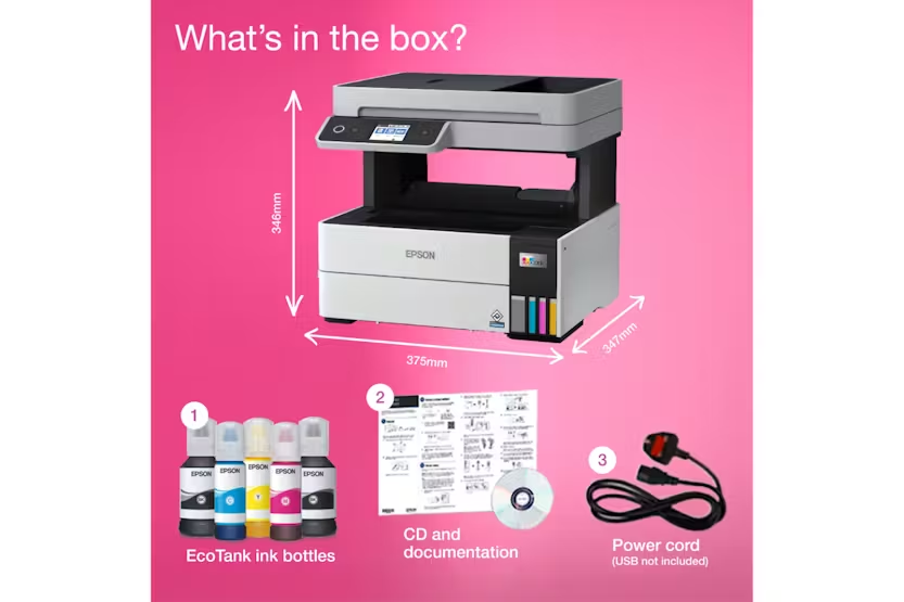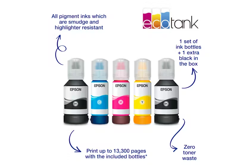 The Epson EcoTank ET-5150 All-in-One Inkjet Printer is a must-have for busy home offices and small businesses. With the ability to print up to 13,300 pages in black and 5,200 pages in color, this feature-rich A4 printer offers ultra-low-cost printing, fast print speeds, Wi-Fi connectivity, automatic double-sided printing, a large paper tray, and a 35-page automatic document feeder. The 6.1cm LCD touchscreen makes it easy to navigate the printer's extensive range of features, while the included EcoTank ink series delivers business-quality prints that are smudge, water, and highlighter resistant. Designed for efficiency and reliability, the Epson EcoTank ET-5150 allows you to get more done in less time with its ultra-fast printing speeds and first page print time as fast as 7 seconds. The simple and mess-free ink tank system, along with the included inks that can produce thousands of pages, ensures low intervention printing. With multiple connectivity options, including Wi-Fi, Wi-Fi Direct, and Ethernet, you can easily print from almost anywhere using smart devices. Upgrade your home office with the Epson EcoTank ET-5150 for high-quality printing, copying, and scanning all in one machine.