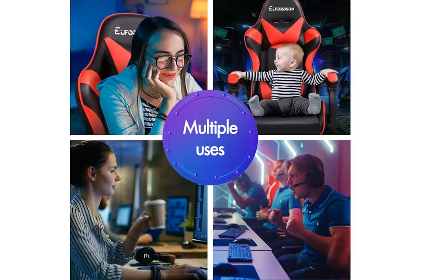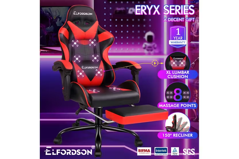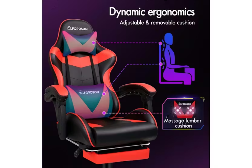 Upgrade your gaming experience with the Elfordson 2-Point Massage Gaming Chair in striking red. Designed for professionals and gamers alike, this chair features innovative lumbar massage technology for precise muscle relaxation. The high-density foam padding and adjustable cushions ensure all-day comfort, while the durable construction guarantees long-lasting use. With dynamic ergonomics and premium materials, this chair is a must-have for anyone who spends extended periods at their desk. Experience ultimate luxury and comfort with the Elfordson 2-Point Massage Gaming Chair. With a 150° recliner, adjustable cushions, and whole-piece foam construction, this chair offers enhanced support for your back and neck. The lumbar massage feature, premium materials, and ergonomic design make this chair perfect for long gaming sessions or workdays. Upgrade your setup with this stylish and functional gaming chair today.