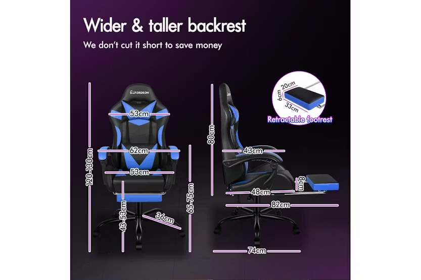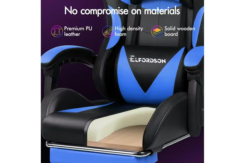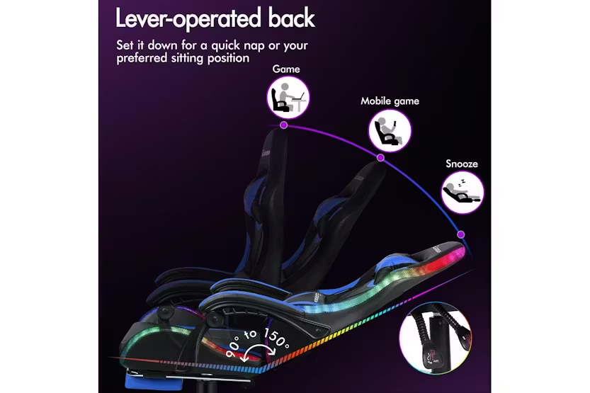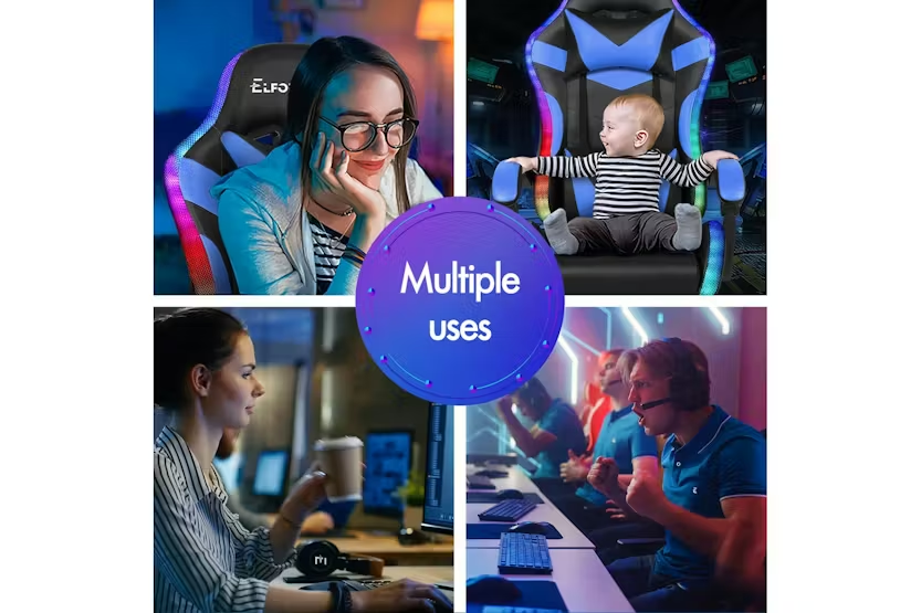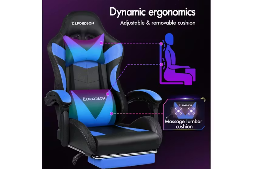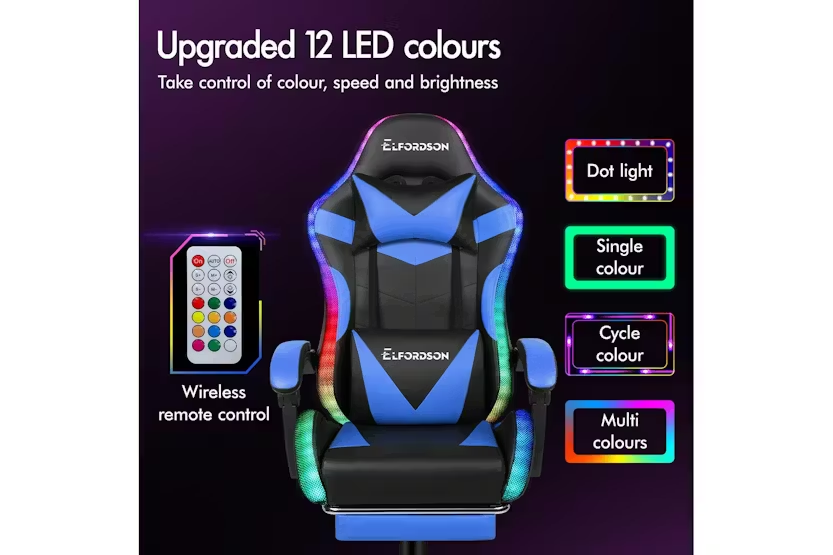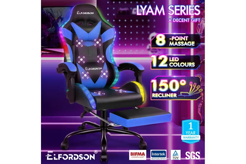 Experience ultimate comfort and relaxation with the Elfordson Led 8-Point Massage Gaming Chair in Blue. This innovative chair features an 8-point massage system from upper back to thighs, perfect for professionals and gamers who spend long hours at their desks. The dynamic ergonomic design, premium materials, and multiple adjustable features ensure a comfortable and personalized seating experience, while the 366 Plus RGB LED light effects add a touch of style to your gaming setup. Upgrade your gaming experience with this high-quality, durable chair that supports up to 180kg. The Elfordson Led Gaming Chair is designed for those who demand both comfort and style. With features like a lever-operated 150° recliner, retractable footrest, and adjustable lumbar cushion, this chair provides the perfect balance of support and relaxation. The high-density foam padding and extra-large lumbar support ensure all-day comfort, while the 8-point massage function helps alleviate stress and tension. Elevate your gaming experience with this premium chair that offers both functionality and luxury.