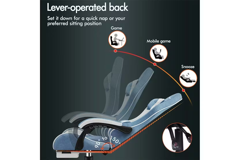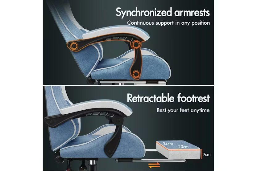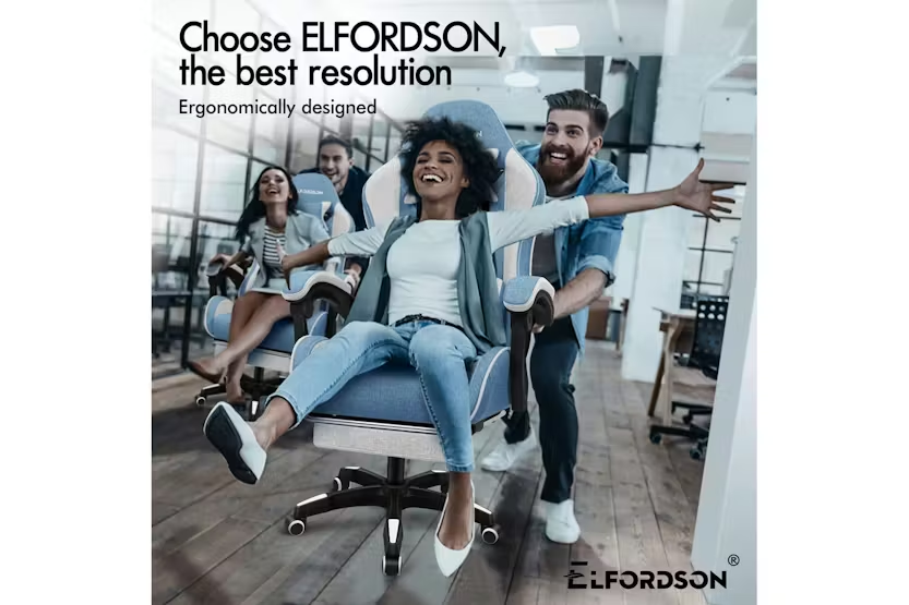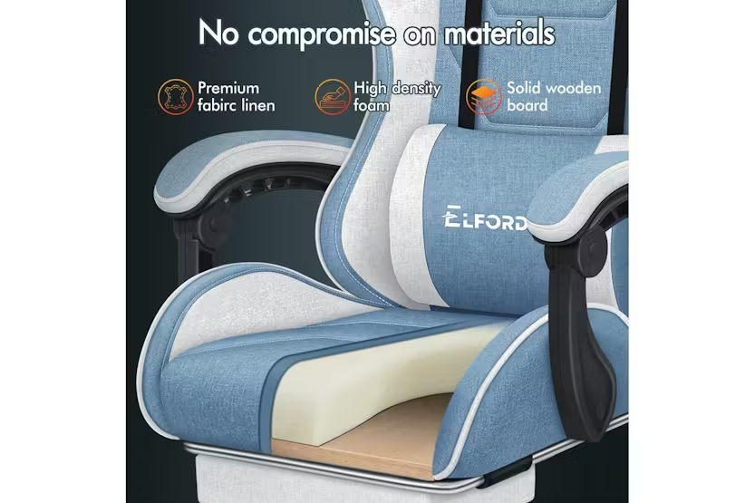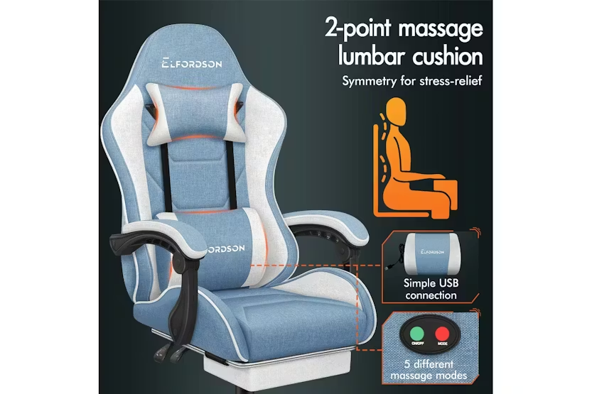 Enhance your gaming or work experience with the Elfordson Gaming Chair in blue fabric. This chair boasts a dynamic ergonomic design, 2-point massage lumbar cushion, and high back support for ultimate comfort and style. With a weight capacity of 180kg and 360-degree swivel capability, this chair is a must-have for any gaming enthusiast or professional looking for premium quality and resiliency. Order now for free delivery and step into a realm of unparalleled luxury at your desk.