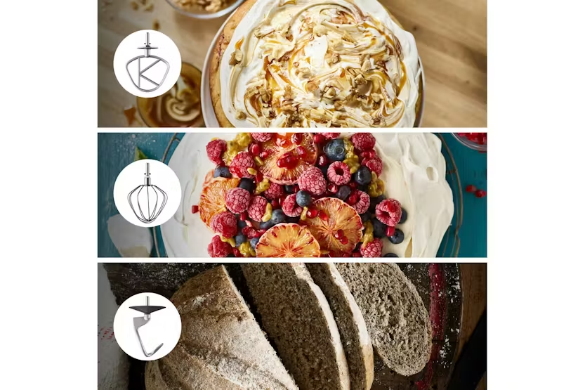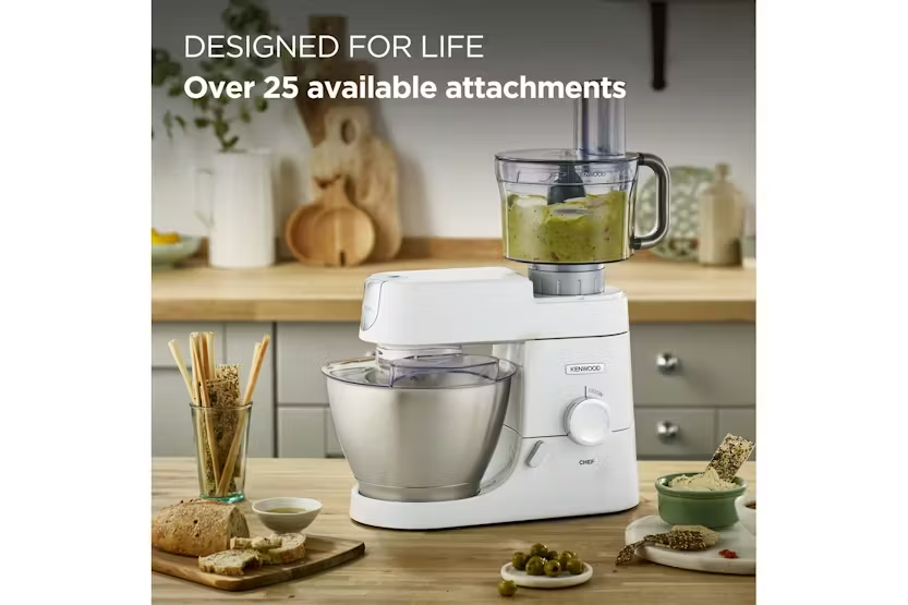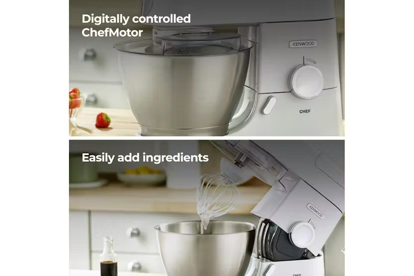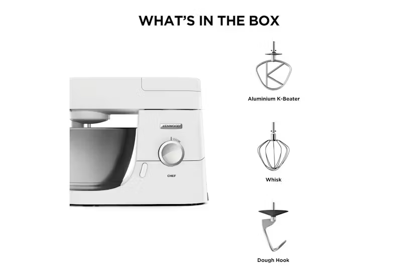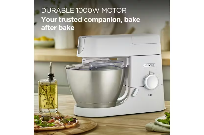The Kenwood 4.6L Chef Food Mixer in white is a reliable kitchen machine designed to make food preparation a breeze. With dedicated bowl tools and over 20 attachments available, this mixer allows you to create a variety of dishes with ease. The 1000W motor and variable speed settings ensure great results every time, making it the perfect addition to any kitchen. Included with the mixer are high-quality bowl tools, a splashguard, and a grey spatula, offering a generous 4.6L bowl capacity for all your mixing needs. Whether you're whipping up cream, kneading dough, or creating homemade salsa, the Kenwood Chef Food Mixer provides the performance and versatility you need to bring your culinary creations to life.