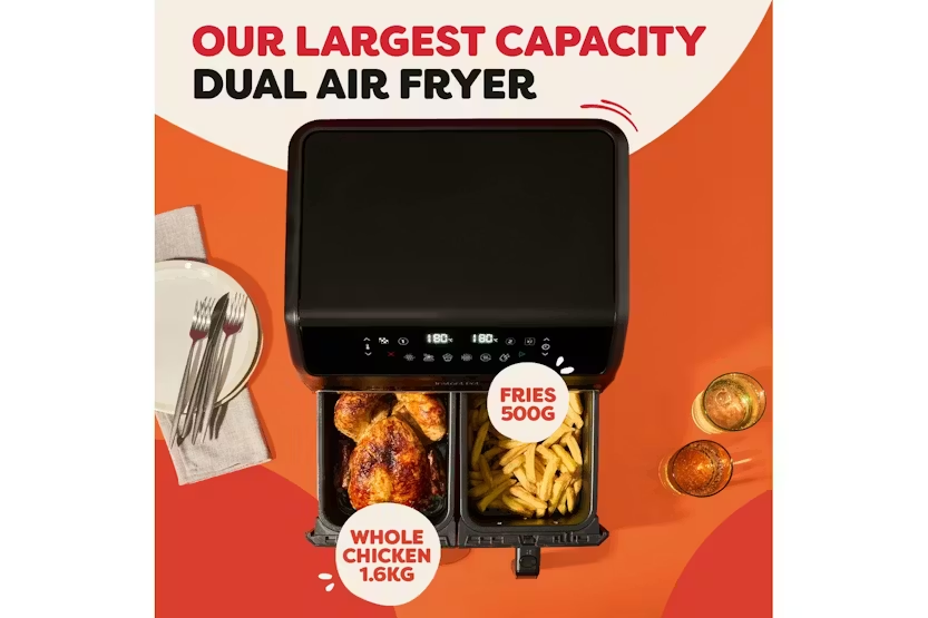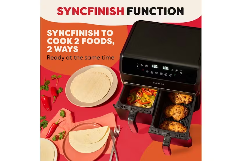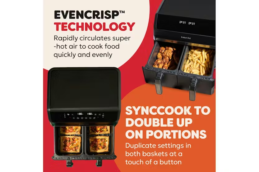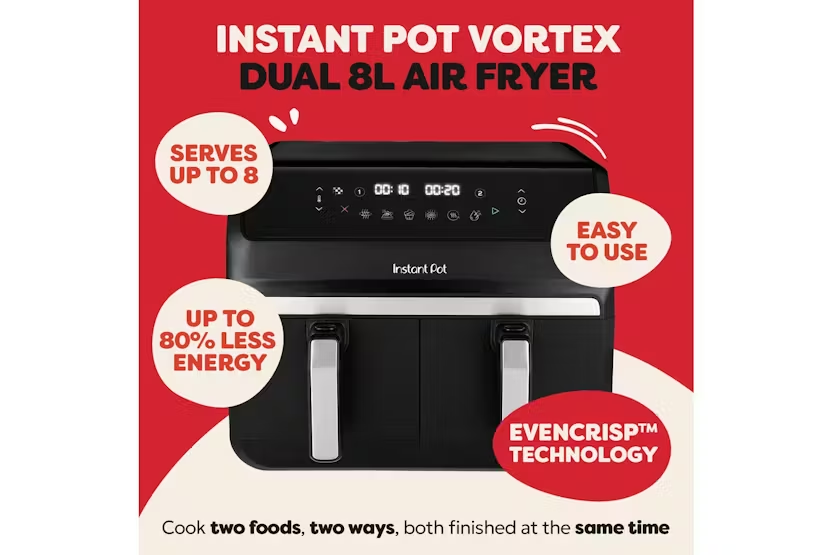The Instant Pot Vortex Dual 8L Air Fryer in sleek black is the ultimate kitchen appliance for cooking up delicious meals with ease. With two 4L capacity baskets, you can cook for the whole family or whip up solo meals in minutes. The innovative SyncCook™ and SyncFinish™ functions allow you to mirror settings between baskets or cook each basket separately, giving you ultimate flexibility in the kitchen. Plus, with up to 80% energy savings compared to traditional ovens, you can enjoy crispy, healthy meals while saving money and the environment. Cook bigger, cook better with the Instant Pot Vortex Air Fryer. With 8-in-1 cooking capabilities including air fry, bake, grill, dehydrate, roast, reheat, SyncCook™ & SyncFinish™, this versatile appliance lets you create a variety of dishes with ease. The easy-to-use control panel and safety features make cooking a breeze, while the large-capacity dual basket design ensures you can whip up feasts in minutes. Say goodbye to long cooking times and hello to delicious meals in minutes with the Instant Pot Vortex Air Fryer.