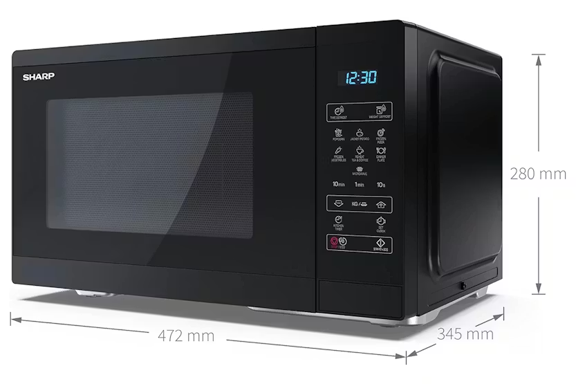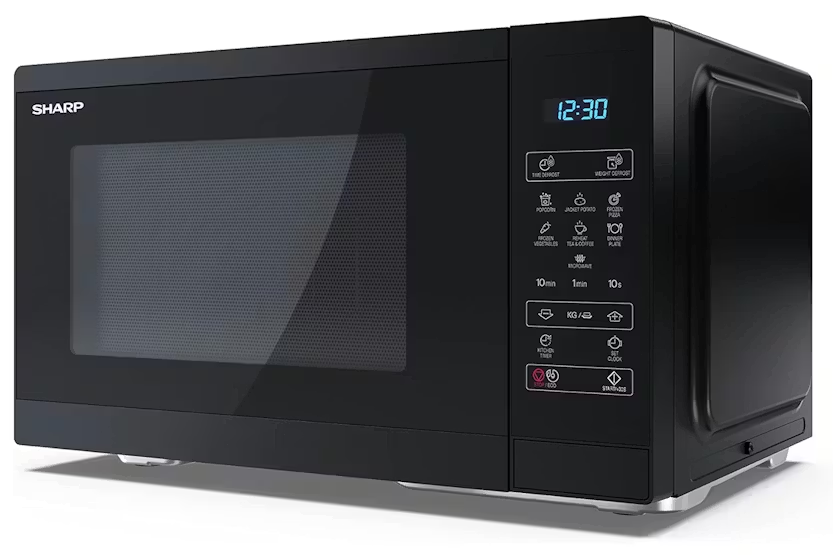 Description 900 Watt Digital Microwave The 25L capacity and sleek black handle-less design makes this the ideal microwave oven for any kitchen. Touch Control and Digital Display Easy to read blue LED screen shows the time when the microwave is not in use, and features a handy kitchen timer function & child safety lock. Powerful Cooking at Home Comes complete with 8 automatic programmes and 11 levels of power, including drink reheat, plate reheat and time/weight defrost settings. Easy to Use Counter-top Microwave The adjustable timer helps you ensure your food is cooked ideally, while the flat contours are designed to be easily wiped clean. Turntable Inside Cooks and re-heats food evenly and quickly. Enjoy soups, jacket potatoes, popcorn, mug brownies and more. The Sharp is a 900W solo microwave with a digital touch control panel. It's contemporary look will compliment your modern kitchen. The blue LED display functions as a clock when the microwave is not in use and can also be used as a kitchen timer. Easy to use and with a large capacity, 11 power levels and 8 automatic cooking programmes - this is a great option if you are looking for a microwave for a medium to large family household. Large Capacity Featuring a 25 litre capacity, it can easily hold a large sized dinner plate, perfectly holds the grill rack and the 288mm glass turntable. Digital Touch Panel The digital touch control panel makes selecting your programmes easy and along with the rest of the Microwave can be easily wiped clean. Cooking Features 8 cooking programmes; popcorn, jacket potato, pizza, frozen vegetables, reheat drinks, reheat dinner plate, plus time and weight defrost. Product Features: Material: Glass, stainless steel Straight design easy to clean