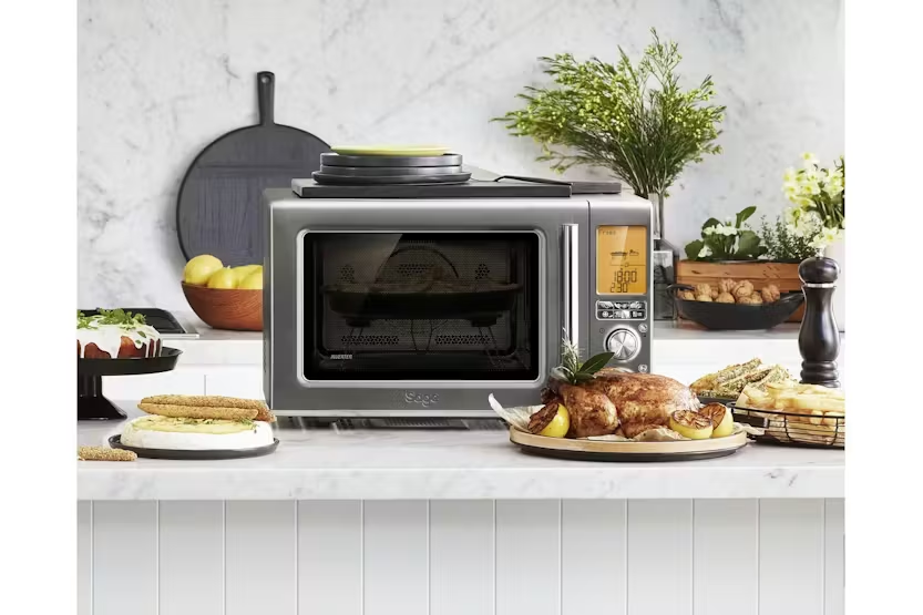 Description Online Only The master of multi-tasking. Air Fryer, Convection Oven & Microwave. 2 appliances to suit everyone's needs in the kitchen from large families to a small kitchen. Create delicious flavoursome meals and more in less time, every time by alternating between cooking functions. Air Fry High heat circulates evenly with the crisper pan in the centre for golden, crispy and crunchy French fries, pizza and chicken nuggets. Convection Oven. Convection ovens use a fan and hardware system that regular ovens lack. Convection helps blow hot air over and around the food, resulting in faster and more even cooking. Ideal for creating delicious dishes such as velvety chocolate puddings. Microwave. The Power Smoothing™ Inverter does away with the old ON-OFF method to give you precise even heat and power distribution. Sage’s smart presets make cooking, reheating and defrosting easier Combi Wave Element iQ System Our Element iQ system steers power to where and when it’s needed to create the ideal cooking environment, for perfect results. The Combi Wave 3 in 1 also features Fast Combi and Cook from Frozen presets along with clever shortcuts, all designed to make life easier in the kitchen..