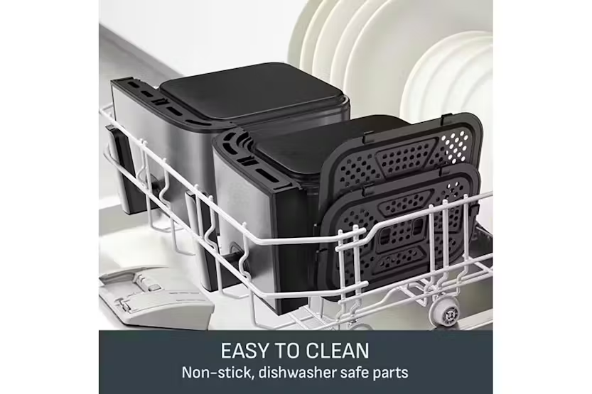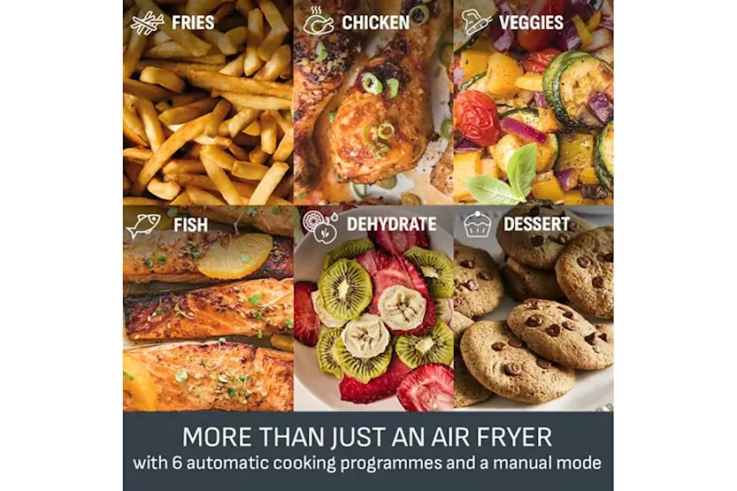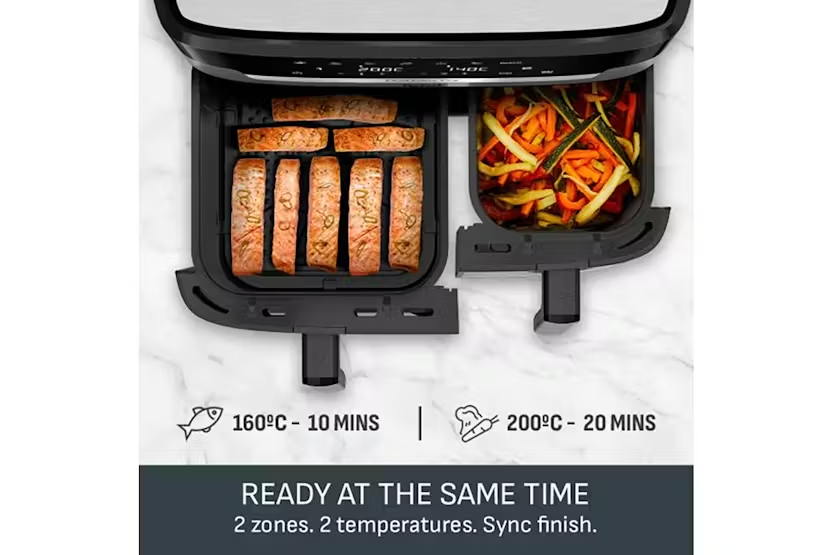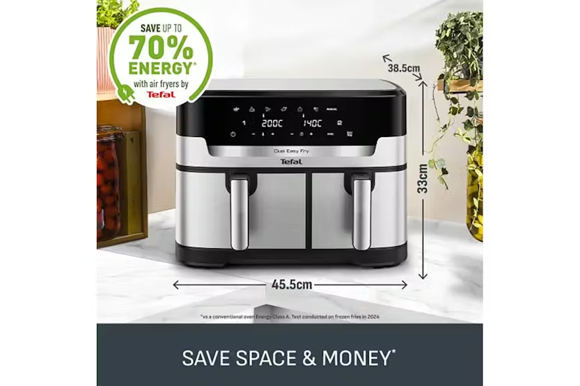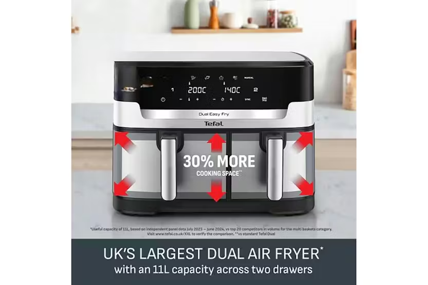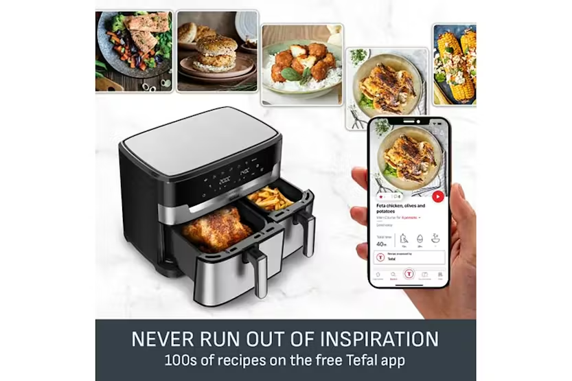 Description Easy Fry: Dual XXL 11L total capacity with a 6.5L drawer and a 4.5L drawer. Perfect for balanced, family-size meals in one go. Useful capacity of 111, hased an independent panel data July 2023-June 2024, vs top 20 competitors in volume for the multi baskets category. Cook Separately Eat Together With Sync Finish Automatically times your dishes to finish cooking at the same time Healthy Cooking Inspiration Less Oil Fried foods without the guilt - deliciously crispy results with 99% less added fat Free Tefal App 100s of recipes on the free app- never run out of inspiration Discover a family-friendly dual air fryer that prepares a complete, generous meal in one go! From crispy fries to mouthwatering salmon, easily prepare a wide variety of balanced delicious meals: a large drawer holds big ingredients while a regular drawer is perfect for sides. Choose from 6 pre-set programs, including a manual setting, and consume up to 70% less energy than a traditional oven. Cook up to 45% faster than a traditional oven, too! With an 11 L capacity, tefal's largest dual air fryer has the whole family covered. It's 6.5 L drawer is perfect for big ingredients like a 2 kg roast chicken or a 24-inch pizza, while the regular 4.5 L drawer cooks 1 kg of fries or a tray of 9 muffins with ease. Ideal for 8 to 10 people! Uk’s Largest Dual Air Fryer Complete with a XXL capacity (11 l) it comes equipped with two spacious drawers- a 6.5 l drawer perfect for sizeable ingredients like a 2 kg sunday roast, and a 4.5 l drawer designed for sides such as 1 kg of french fries. Ideal for serving 8 to 10 people. 30% More Cooking Space Perfect for batch cooking, catering, and large families. Cook two different food at once, utilising the dual drawer capability, for a complete family meal prepared and ready with tefal synchronized cooking function. Ready at the Same Time From crispy fries to mouthwatering salmon, easily prepare a wide variety of balanced and delicious everyday meals that everyone will love. Easy to Clean The dishwasher-safe non-stick air frying basket ensures easy clean-up and a stress-free cooking experience. Never Run Out of Inspiration With the free my tefal app, discover recipe ideas based on your taste, time or ingredients on hand, plus create your shopping list, plan your meals and much more. More Than Just an Air Fryer 6 pre-set programs—fries, chicken, vegetables, fish, dessert, dehydration and manual temperature control (40-200°c)—for perfect results with ease. Save Space & Money Uses up to 70% less energy and cooks up to 45% faster than traditional ovens.* Product Features: XXL dual air fryer that cooks two different food at once, for a complete meal ready in one go From crispy fries to mouthwatering salmon, easily prepare a wide variety of balanced meals that everyone will love Dishwasher-safe non-stick air frying basket for easy clean-up and a stress-free cooking experience Free app for recipe ideas based on your taste, time or ingredients on hand—plus much more Read More