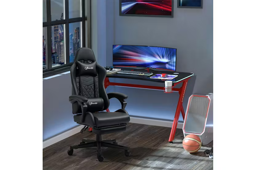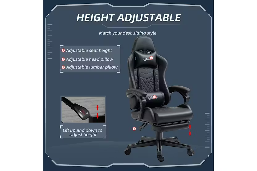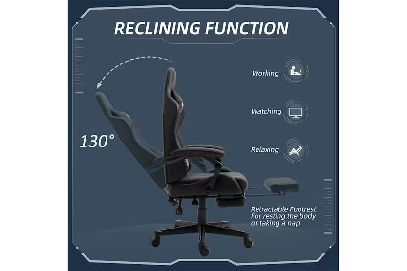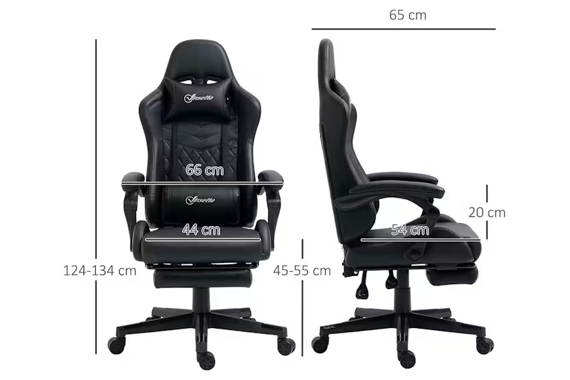 Description Online Only - Free Delivery Experience the bold of the Vinsetto gaming computer chair, designed to make a statement in your dedicated space. Crafted with sleek PU leather and adorned with contrasting stitching, this chair exudes style and impact. Suitable for adults and teenagers alike, it is not limited to e-sports rooms but also enhances the ambiance of offices, studies, and even bedrooms. With adjustable height ranging from 124cm to 134cm and equipped with five smooth-rolling wheels, mobility is effortless. Features: Enjoy a maximum 130-degree reclining backrest with the added convenience of a retractable footrest Diamond-shaped contrast-colour stitching adds a touch of luxury and elegance to the chair's appearance Equipped with five bottom wheels, this chair allows for effortless movement and manoeuvrability Embrace a cool and dynamic gaming atmosphere with the sleek racing style of this chair Easily adjust the height of the chair using the under-seat gas lever to find your optimal sitting position Specification: Material: Sponge, Nylon, PU Leather Reclining dimension: 64W x 107.5D x 105-115H cm Seat dimension: 44W x 54D x 45-55H cm Armrest height(to Seat): 20cm Back size: 52W x 81L cm Max load: 120 kg