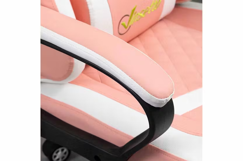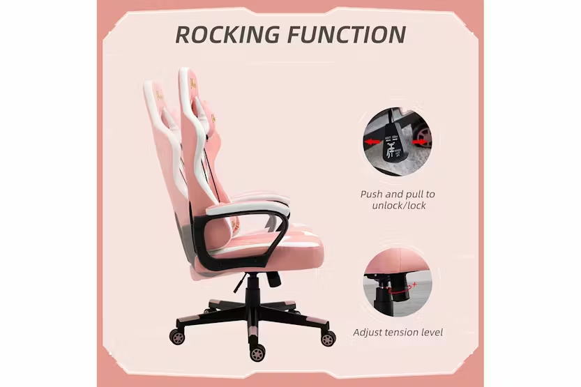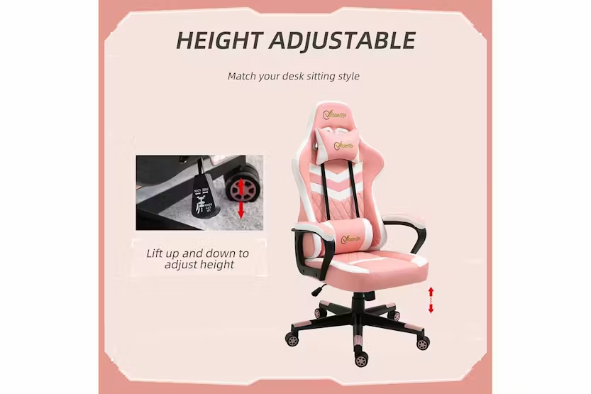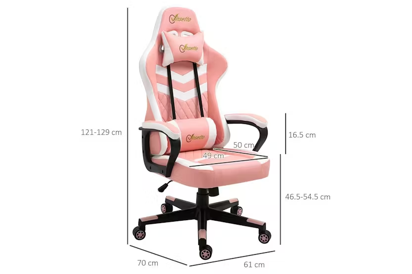 Description Online Only - Free Delivery Be bold in your gaming comfort and style, thanks to this chair from Vinsetto. Its uber-cool design is formed of PU leather upholstery, in a block colour pattern design, with a wing-shaped back for extra impact. Ergonomic design is formed of a large swivel seat to move around easily, a high back and fixed armrests, with thick padding all over to keep you comfortable. Chair also rocks if you want to relax. Finished with five wheels and also comes with a lumbar and neck pillow, with our signature branding stitched in. Specifications: Material: Sponge, Steel, PVC leather Seat dimension: 49W x 50D x 46.5-54.5H cm Armrest height(to Seat): 16.5 cm Back size: 58W x 80L cm Product Features: Adjustable height to sit at working/gaming level best for you Back gently rocks Ergonomic features: swivel seat, five-wheeled base, tall back and fixed armrests Cool design, formed of the PU leather upholstery in a bold colour-block design Perfect for gaming/racing rooms, or even adding flair to your study and offices Maximum load 120 kg