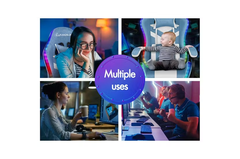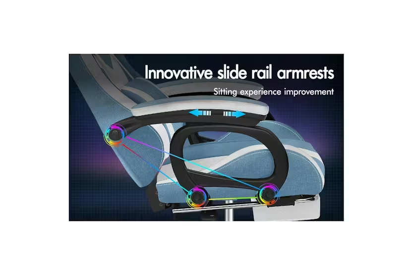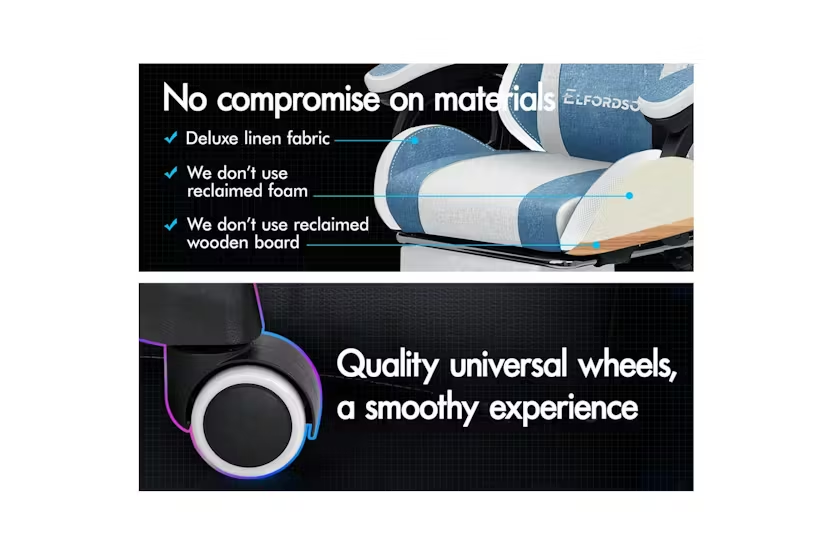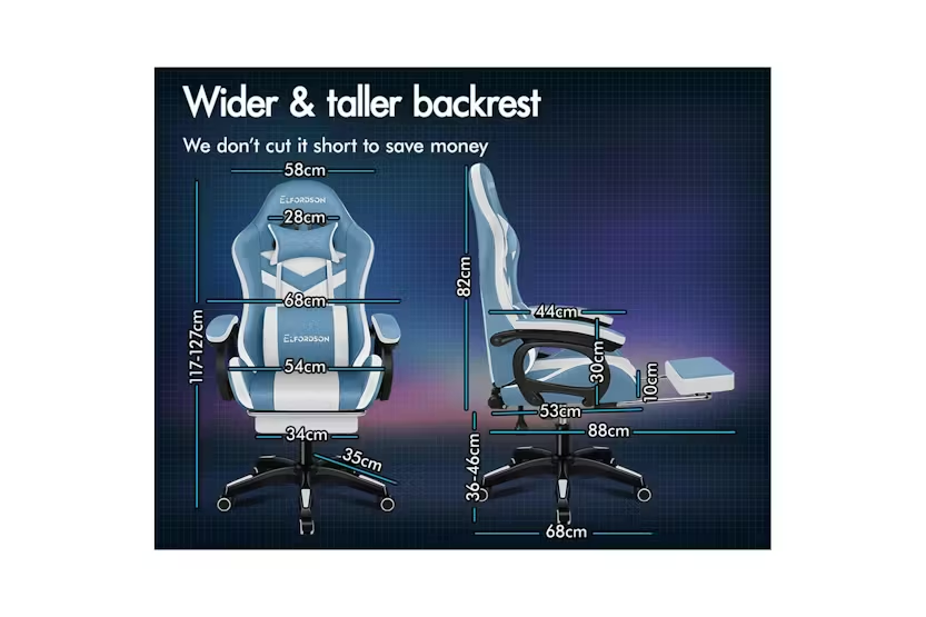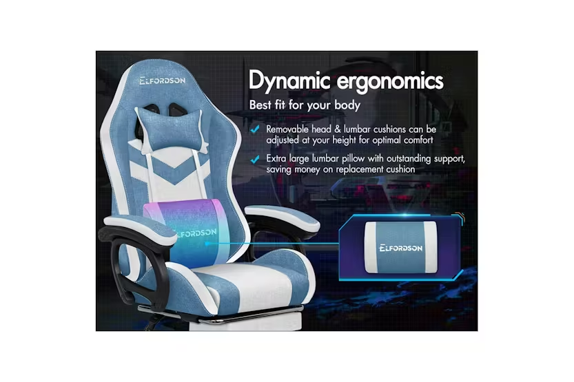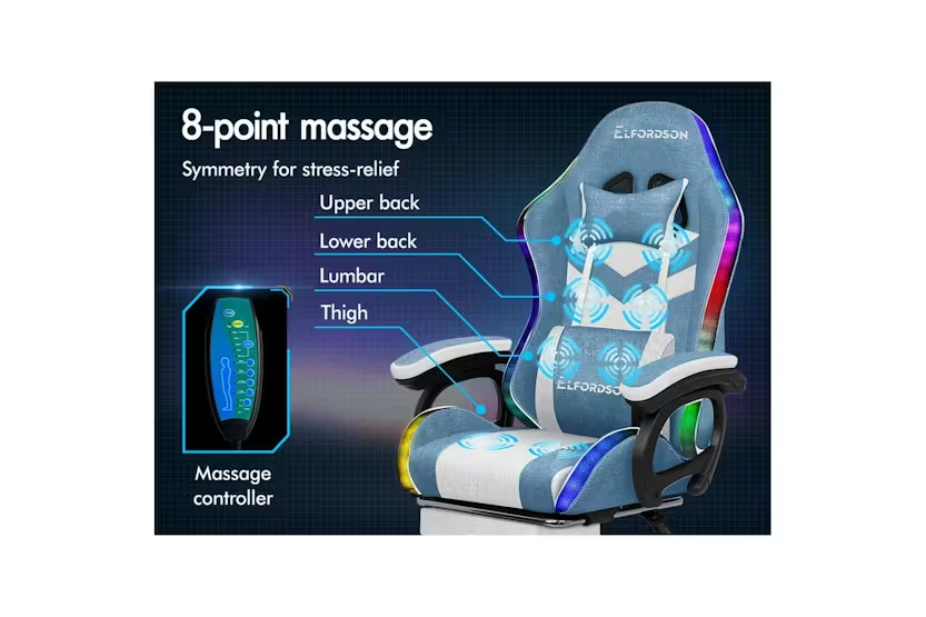 Description Online Only - Free Delivery ELFORDSON LED & Massage Gaming Chair Fabric Collection LED chairs are cool gaming chairs that can help you stand out from the gaming crowd. Elfordson supreme LED & massage gaming office chair is born for serious gamer, and the smart working executive who loves the adrenaline of residing in a gaming chair. Elfordson all-metal frame racer chair is the ultimate for movers and shakers like yourself. Crafted with innovation in mind, we upgraded the gaming chair with 12 colours of LED and 8 massage points (while old models only equips with 7 LED & 7 massage points), making the gaming experience more comfortable and enjoyable. That means aside from looking good with more terrific customisable LED lighting effect, the chair also provides a better massage while enjoying your favorite game. Furthermore, its ergonomic S-curve design with detachable and height-adjustable lumbar and neck cushions offers perfect support to make you relaxed, allowing you to work or play at your peak for long periods of time in optimal comfort. Combined with retractable padded footrest that suits your personalized positions while sitting, sleeping or playing games. An elite in quality and design, your solution to true comfort. It features 150 degree back recline adjustment and 360 degree swivel, you can lock the position of reclination as you wish. Upholstery crafted with premium linen fabric and generous foam paddings ensures optimal durability and easy cleaning. A stylish nylon base with TUV certified casters, Intertek approved linen fabric, SGS approved Gas-Lift system and tilt function, delivering absolute five star luxury. And unlike some other sellers, we have no compromise on materials used. We guarantee that no cycled foams are used, no backrest is cut short or narrow to save money, and no seat foam is cut thin to save cost. The Elfordson range is available in multiple colours and designs, browse Elfordson store and choose one that best suits you or your room. Take the stress out of work and experience superior comfort at your desk - order your Elfordson gaming office chair today! Specifications Intertek approved supreme linen fabric SGS approved gas-lift, no worries about explosion TUV approved caster wheels Triple-layer seat: linen fabric + resilience foam + robust wooden board High weight capacity: 180kg Colour: Blue & White What's in the Box: 1 x Elfordson office chair 1 x Assembly manual Product Features: Customisable 12 colours RGB LED light You can customize light emitting area: backrest only or backrest & seat 300 lighting effects with remote control 8-point massage & 5 massage modes with massage controller Upgraded slide rail armrests Heavy-duty all-metal frame racer Dynamic ergonomics design, best fit for your body Removable and height-adjustable head & lumbar cushions Extra large lumbar pillow for better support! No compromise on materials, we don't use recycled foam Generous foam paddings, we don't cut it thin to save money Up to 150 degree back recline adjustment Able to lock the reclination position Wider & taller backrest, we don't cut it short to save cost Retractable padded footrest Premium universal wheels, a smoothy experience Deluxe tilt adjustment Whole-piece moulding foam, better weight distribution and support Smoothly 360 degree swivel Deluxe PP plastic armrests with padding, wide and supportive High resilience foam in car-seat grade Eliminates back and shoulder pressure Sporty nylon base with a touch of matching colour Ideal for gamer and business uses