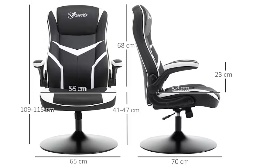 Description Online Only - Free Delivery Find your ideal gaming chair with the Vinsetto gaming chair. This chair offers a winning combination of style and comfort. With its eye-catching colour block faux leather design, spacious seat, and thick padding, it delivers both aesthetics and cosiness. You can easily adjust its height between 109-115 cm to find the perfect sitting position. Plus, the lift-up arms allow you to conveniently store the chair under your desk when not in use. Specifications: Materials: Sponge, Steel and plastic Dimensions: 109-115H x 65W x 70D cm. Seat: 41-47 x 55W x 53D cm. Back to seat: 68H cm. Back: 11D cm. Armrest to seat: 23H cm Product Features: Perfect for gaming, home offices, study rooms, and more Rocking seat for moments of relaxation Adjustable height of 109-115 cm Flip-up armrests for added roominess and easy tucking under tables Thick sponge padding on the seat, headrest, and armrests for maximum comfort Stylish and easy-to-clean faux leather upholstery Maximum weight capacity of 120 kg
