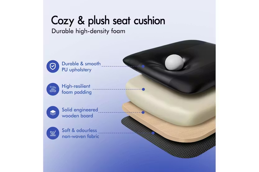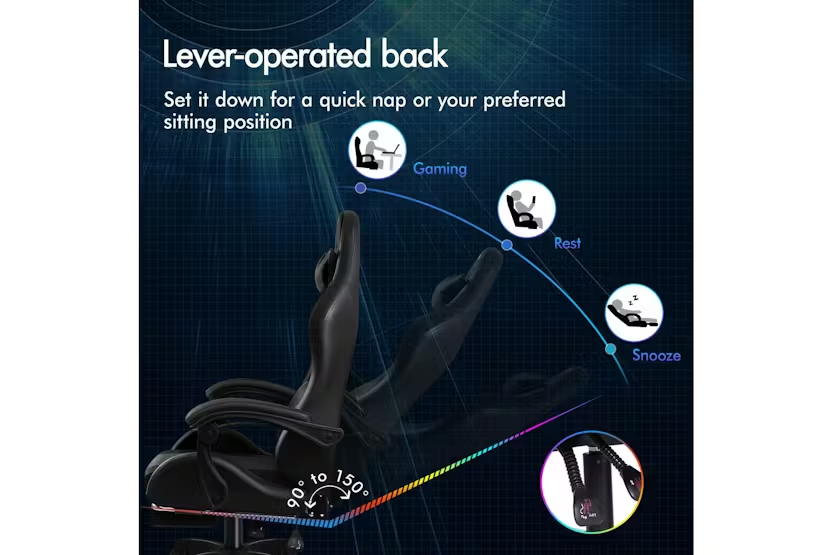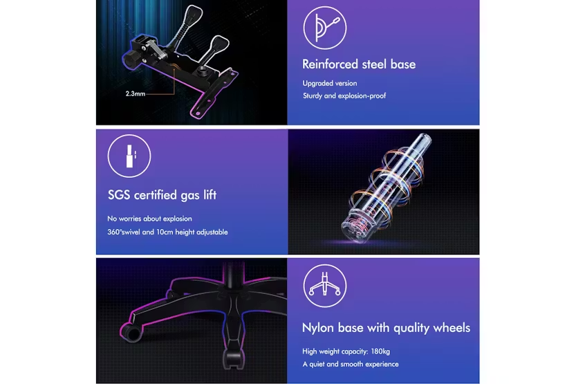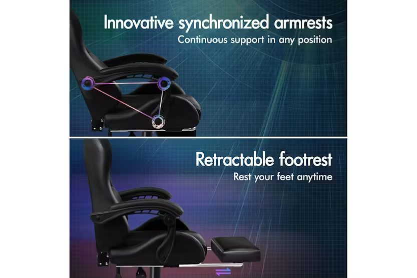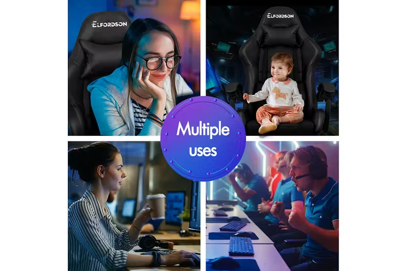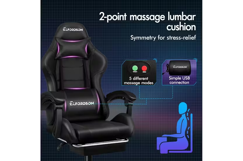 Description Online Only - Free Delivery Elfordson Gaming Chair, A Decent Gift Elite Collection The Elfordson supreme gaming office chair is born for serious gamer, and the smart working executive who loves the adrenaline of residing in a gaming chair. Elfordson all-metal frame racer chair is the ultimate for movers and shakers like yourself. A stylish nylon base with TUV certified casters, Intertek approved PU leather, SGS approved Gas-Lift system and tilt function, delivering absolute five star luxury. Combined with retractable padded footrest that suits your personalized positions while sitting, sleeping or playing games. An elite in quality and design, your solution to true comfort. Its ergonomic S-curve design with detachable and height-adjustable lumbar and neck cushions offers perfect support to make you relaxed, allowing you to work or play at your peak for long periods of time in optimal comfort. It features 150 degree back recline adjustment and 360 degree swivel, you can lock the position of reclination as you wish. Upholstery crafted from premium PU leather and generous foam paddings ensures optimal durability and easy cleaning. And unlike some other sellers, we have no compromise on materials used. We guarantee that no cycled foams are used, no backrest is cut short or narrow to save money, and no seat foam is cut thin to save cost. The Elfordson range is available in multiple colours and designs, browse Elfordson store and choose one that best suits you or your room. Take the stress out of work and experience superior comfort at your desk - order your Elfordson gaming office chair today!. Specifications: Intertek approved supreme PU leather SGS approved gas-lift, no worries about explosion TUV approved caster wheels Triple-layer seat: PU leather + resilience foam High weight capacity: 180Kg Product Features: Smart gaming chair Heavy-duty all-metal frame racer S-Curve design, best fit for your body Removable and height-adjustable head & lumbar cushions Extra large lumbar pillow for better support! Upgraded lumbar cushion with massage function! 2-Point massage & 5 vibration modes No compromise on materials, we don't use recycled foam Generous foam paddings, we don't cut it thin to save money Up to 150 degree back recline adjustment Able to lock the reclination position Wider & taller backrest, we don't cut it short to save cost Retractable padded footrest Premium universal wheels, a smoothy experience Deluxe tilt adjustment Whole-piece moulding foam, better weight distribution and support Smoothly 360 degree swivel Deluxe PP plastic armrests with padding, wide and supportive High resilience foam in car-seat grade Eliminates back and shoulder pressure Sporty nylon base with a touch of colour Ideal for gamer and business uses