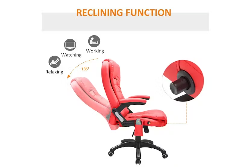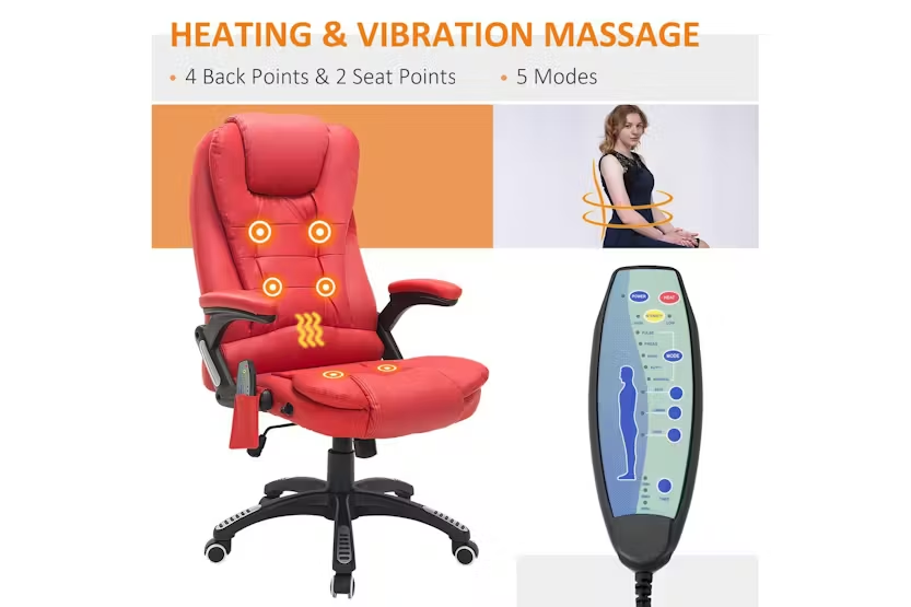 Description Online Only - Free Delivery Experience unrivalled comfort and functionality in your workspace with the HOMCOM 921-284V70RD Ergonomic Chair with Massage. Elevate your at-home office experience with this luxurious chair, engineered with unique features that have melded comfort with professionalism seamlessly. Designed with style and functionality in mind, the HOMCOM office chair enhanced with heat and massage functions offers an admirable blend of modern aesthetics and state-of-the-art amenities. As a sophisticated office user in Ireland, indulge in the coveted freedom of personalising your experience, as the heat and massage operations work independently of each other. Striking the balance of style, comfort, and dining office productivity, the HOMCOM ergonomic chair boasts a classic executive design with premium faux leather that amps up your workspace's integrity while offering years of unwavering boss-life bliss. You will appreciate the thick padding on those long working hours, designed for supreme comfort assuring that no day is too long at the office. Raising the bar high on support, the tall back and the sturdy armrests ensure you have the right posture, significantly reducing backaches and neck strains. The five wheels on the base add to the convenience, ensuring mobility when the multitasking days kick in. Joyously lean into the work-from-home culture with the HOMCOM ergonomic office chair designed to optimise comfort for Irish consumers. Celebrate your professional endeavours embraced in comfort that rivals the traditional office setup, bringing the whole office experience right to your doorstep. To the savvy Irish who appreciates value, invest in the HOMCOM office chair that delivers everything an ideal office chair must, fusing efficiency, comfort and style without fail. Elevate your workspace whim with the chair that screams you deserve it! Key Features: Heat and massage functions that operate independently Luxurious faux leather design Thick padding for maximum comfort Tall back and armrests for optimal support Five wheel-base for effortless mobility