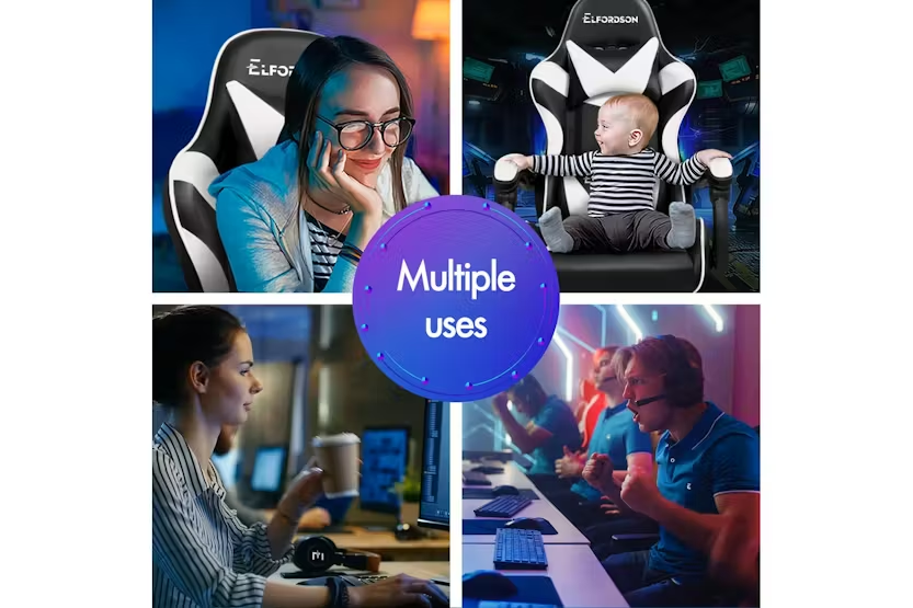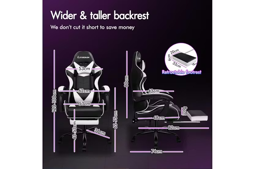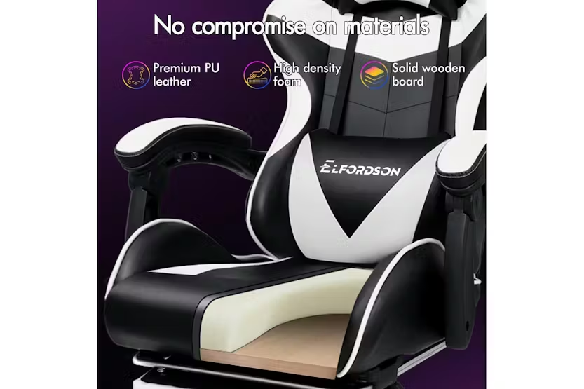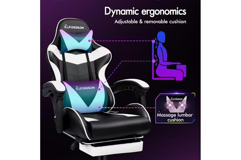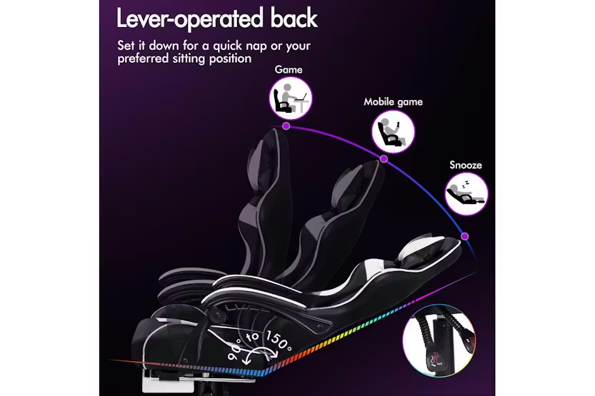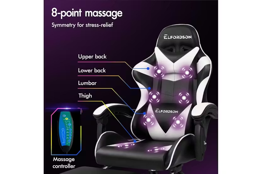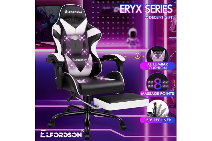 Description Online Only - Free Delivery Check out the video: Adjustable Cushions 150° Recliner Premium Materials Whole-piece Foam Dimension Lumbar Massage Gaming Chair Featuring innovative 2-point massage on lumbar support, Eryx series provides precise muscle relaxation on your lumbar (or lower back). Definitely designed for professionals and game lovers who spend extended periods at desks. (Massaging vibration simply powered by the USB charge). Enhanced Comfort High-density foam padding on back and seat fully contours your body shape, built for all-day comfort. Adjustable and removable neck pillow, lumbar cushion adapts your sitting posture. 80cm high backrest ensures ultimate ease, even for those with a larger build. Built to Last A stylish chrome base with TUV-certified casters, Intertek-approved PU leather upholstered in generous foam paddings, SGS-approved Gas-Lift system, delivering absolute five-star luxury. Dynamic Ergonomics With backrest recliner between 90° and 150°, retractable padded footrest, 10cm seat height adjustments, and 360° swivel castors, this chair fits comfortably under most gaming desks or workstations. Product Features Seat material type: Faux leather Frame material: Engineered wood Upholstered leather Swivel Seat lock 2-Point lumbar massage Head support Read More