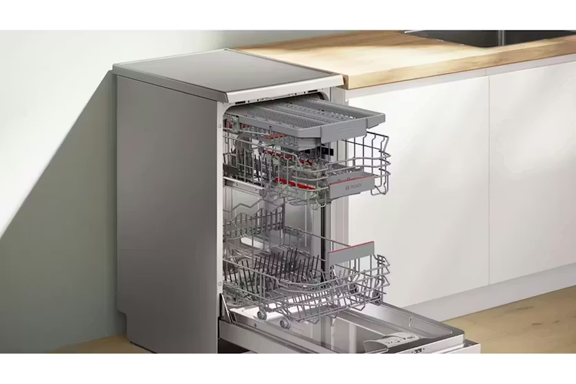 Description Extra Drying Option for Difficult-to-dry Loads Activating the Extra Dry option dries your dishes extra-thoroughly by using a higher temperature during the rinse cycle and a longer drying phase – with just one push of a button. Extra Dry your dishes for those difficult-to-dry loads. Remarkably Quiet Dishwashing Nobody likes being distracted noise. So if peace and quiet are important to you, the lence Plus 44 dB dishwasher is the answer. It's remarkably quiet, so your kitchen stays calm and tranquil. Redefining Racks at a Touch If you don’t have a key ingredient, you change your menu. Can your Slimline dishwasher respond as flexibly to different loads? The Vario Flex baskets and Vario Drawer can. A versatile cutlery drawer is paired with a height-adjustable upper rack. Customize the space to your needs with 6 sets of flip tines, 2 cup shelves, 2 anti-slip elements and stemware support. So grab the sleek basket handles and pull out more packing options. Rackmatic Thanks to the triple Rackmatic system, the height of the top basket can easily be adjusted by up to 5cm, or tilted to just one side so you can fit in large pots and tall stem wine flasses, and still fit your large dinner plates on the bottom rack. And you can do this when its fully loaded, givinvg you more adjustment options and maximum flexibility. Home Connect: An Easy Solution to Help You Get the Most Out of Your Appliance, With Flexible Control and Additional Features Personalise your dishwasher with up to 10 additional programs with Program Download. Whether you are looking for an intensive cleaning cycle for your dirty dishes, or a silent program for your open plan kitchen, it's even easier to find an option that meets your needs. You can also use the Smart Finish Replenishment service to make sure you never run out of dishwasher tabs. Take the Guesswork Out of Cleaning Different loads of washing require different wash settings. Choosing the incorrect programme not only wastes time, but also water and energy. Bosch automatic programmes automatically regulate the water temperature and rinse time during washing to suit the level of soiling and load volume. This means, with automatic programmes you only use as much water as needed for perfect results. The right wash for every load – all at the touch of a button. Your Favourite Function With Just One Touch Make the most out of your dishwasher by simplying your daily life. With the Favourite function you can simply set up your most used programs and options as your favourite combination. The programmed setting can be started via the Home Connect app (available on selected models) or directly on the display with one step. Combine for example the Extra Dry option to the Eco 50° Program and start the dishwasher with only one touch. Personalized settings that get your dishes done by just one touch. Download Programmes for a Perfect Match to Your Everyday Life Sometimes, it can be tough to find a dishwasher programme that suits your individual needs. Bosch dishwashers with Programme Download offer the possibility to download additional programmes via the Home Connect app. Programme Download ensures perfect dishwashing results thanks to programmes that fit your specific needs. Smart Programme Selection Choosing the right programme or each load can be tricky. Programme Assistant makes it easy. Simply answer a few questions in the Home Connect app about the type of load, the level of soiling and personal preferences for energy efficiency, dryness, speed and noise level, and the system recommends the right programme. Then just push start and look forward to your perfectly clean dishware, with minimum effort. Remote Support in Case of an Error It can be annoying when appliances do not work the way they should. Remote Diagnostics is here to help. Simply call Bosch customer service, and with your permission, we can remotely screen your appliance, locate the issue and give you clear advice on how to solve it. In the event an issue cannot be solved, a Bosch service technician can come to your home to resolve the problem, equipped with all the necessary parts already to hand. Smart support, smart solutions. Product Features: Aquasensor Automatic detergent detection Remote Monitoring and Control Programme duration: 3:40 h Maximum adjustability feet: 20 mm Vario Flex basket system Upper rack cup shelf Lower rack cup shelf Glass rack in bottom basket Tamperproof controls AntiFingerprint surface coating 6 programmes: Eco 50 °C, Auto 45-65 °C , Intensive 70 °C, Express 65°, Silence 50 °C, Favourite Read More