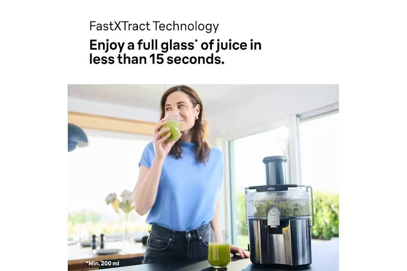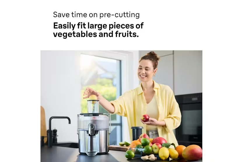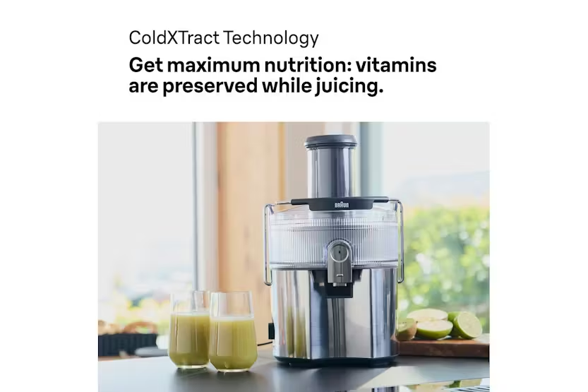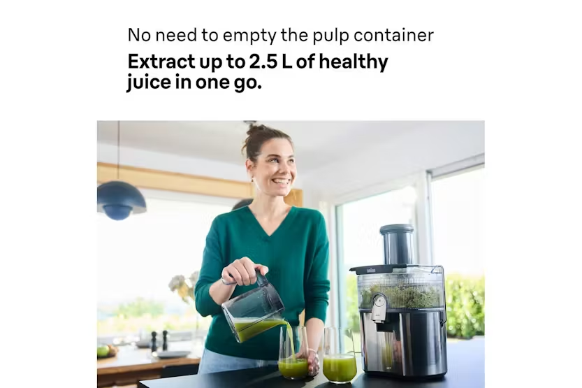 Description The MultiJuice 7 delivers fresh, nutrient-packed juice in seconds. With 1000 watts of power, it extracts up to 2.5 litres of juice from chunky fruit and veg – even whole apples – in one go. ColdXtract Technology keeps your juice cool to lock in nutrients, while the large chute, anti-drip spout and easy-clean design make everyday juicing quick, clean and fuss-free. ColdXtract Technology Keep the vitamins, skip the heat. Our smart cooling system keeps temperature-rise under 1.5°C, so your juice stays nutrient-packed. FastXtract Technology From fruit to glass in under 15 seconds. Because great mornings shouldn't require a time commitment. 2L Pulp Container Extract up to 2.5L of juice without stopping. Less emptying means more time for juicing. 75mm Round Chute Whole apples, welcome. The generous opening handles large fruit and vegetables with ease - no knives needed. Anti-Drip System One push of the Anti-Drip button stops juice from dripping once you remove your glass, keeping counters mess-free. 2-Speed Settings Soft peaches, hard carrots – we've got settings for both. Choose your speed and let the juicer do the rest. Foam Separator Jug Pure juice, no foam. The 800ml jug keeps the froth where it belongs (in the jug, not your glass). Easy Cleaning Dishwasher-safe parts and a purpose-built brush make cleanup surprisingly satisfying. Even the pulp container has smooth, non-stick edges to spare you scrubbing.