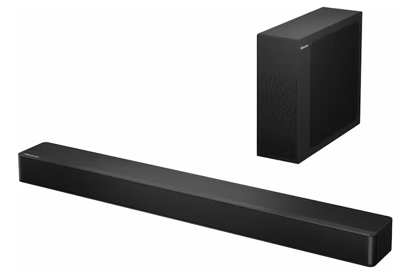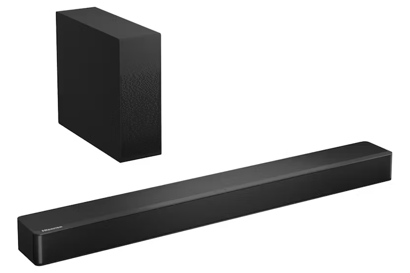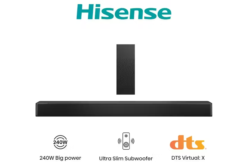 Description Check out the video: 2.1 Channel Speakers: 240W Max Audio Power Upgrade your TV sound instantly with the 2 powerful speakers and a wireless subwoofer that deliver 240W max audio power. Super Bass: Loud Deep Bass With its ultra-slim design, the 120W powerful subwoofer can easily fit into any space. DTS: Virtual X: Wrapped in Sound Powered by DTS: Virtual X, the powerful speakers surround you in 3D audio for a room-filling sound that delivers a truly immersive experience. TV Mate: Made for Each Other The perfect pairing of Hisense TV’s and Soundbars means optimized performance and viewing experience. TV Mode: Greatly Enhance Sound With TV mode technology, connect with your Hisense TV, and make use of the TV’s decoding technology (e.g. Dolby Atmos) to create a better surround experience. EQ Mode: 6 Tailored Sound Modes Get the best audio performance from movies, music, sports, games, and more. All with a simple touch of the remote with 6 preset sound modes. Ez Play: One Remote, Double Enjoyment Use only one, user-friendly remote to adjust Soundbar’s setting from TV, friendly and visual. Multi Connections: Connect, Listen, Enjoy Hisense supports Bluetooth 5.3, Faster & Stable, HDMI ARC, AUX, USB, HDMI ARC, &and OPTICAL. What's in the Box: Wall mount kit Remote control Batteries (2xAAA) HDMI cable Product Features: Channel system : 2.1 CH soundbar Powerful bass Subwoofer output power: 120 W Possible to wall mounted Automatic power-off Automatic switch on: Yes, except for BT, USB Power consumption in standby mode: 0.5 W Read More