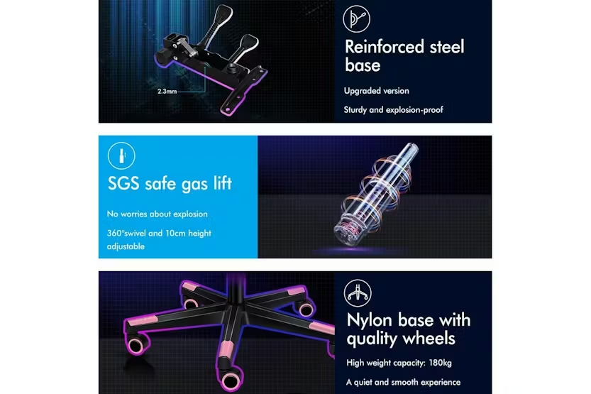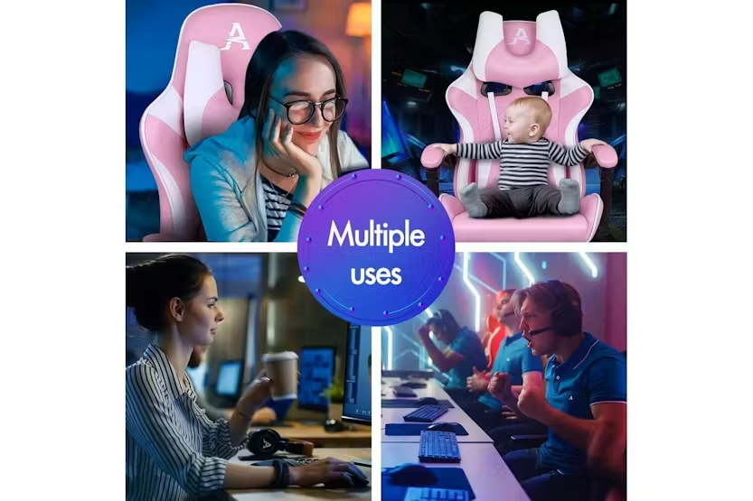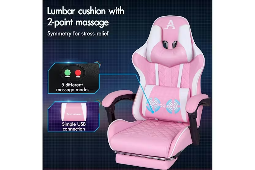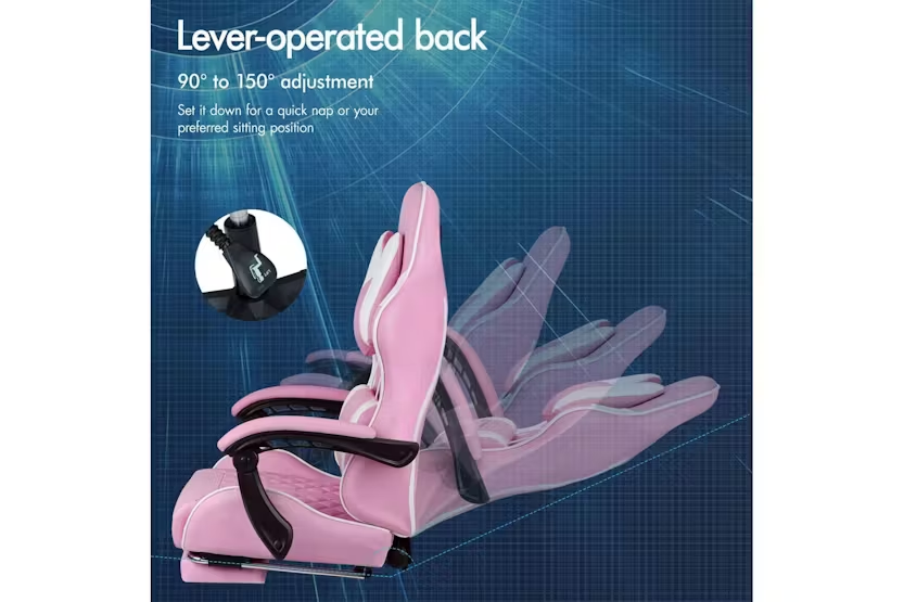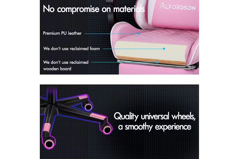 Description ONLINE ONLY Alfordson Gaming Chair | High-Back Faux Leather | Pink Upgrade your gaming and work experience with the Alfordson Gaming Chair, designed for those who demand comfort, durability, and style. Whether you are a dedicated gamer, a busy professional, or someone who spends long hours at the desk, this high-back gaming chair delivers the ultimate in ergonomic support and luxury. Finished in a striking pink faux leather, it is the perfect addition to any modern Irish home office or gaming setup. Engineered with a heavy-duty all-metal frame, the Alfordson Gaming Chair offers exceptional stability and longevity. The S-curve design and extra-wide, taller backrest are tailored to fit your body, eliminating back and shoulder pressure during long sessions. The whole-piece moulding foam padding in the car-seat grade base seat ensures ultra comfort, while the triple-layer seat construction combines premium PU leather and resilience foam for lasting support. Enjoy personalised comfort with up to 150-degree back recline adjustment, allowing you to find the perfect position for gaming, working, or even taking a quick nap. The removable, height-adjustable extra-large lumbar pillow and U-shape headrest provide superior support, reducing fatigue and promoting healthy posture. For moments of relaxation, simply extend the retractable padded footrest and unwind in style. Designed for versatility, this chair is ideal as a gaming chair, office chair, computer chair, or executive chair. The deluxe PP plastic armrests with padding offer wide, supportive comfort, while the sporty nylon base adds a touch of colour and resists dirt. Premium universal wheels and a smooth 360-degree swivel ensure effortless movement across any surface, making it easy to transition between tasks. With a high weight capacity of up to 180kg, the Alfordson Gaming Chair is built to accommodate a wide range of users. The Intertek supreme PU leather is both stylish and easy to clean, while the SGS gas-lift and TUV caster wheels guarantee safety and reliability. Make a statement in your workspace or gaming room with this eye-catching pink chair that combines performance, comfort, and flair. Key Features: Heavy-duty all-metal frame for enhanced durability Ergonomic S-curve design with wider and taller backrest Whole-piece moulding foam padding for superior comfort Up to 150-degree back recline adjustment Removable, height-adjustable extra-large lumbar pillow U-shape headrest for optimal neck support Retractable padded footrest for relaxation Deluxe padded armrests and sporty nylon base Premium universal wheels and 360-degree swivel High weight capacity: supports up to 180kg Stylish pink faux leather finish Specifications: Material: Intertek supreme PU leather, resilience foam Frame: All-metal Base: Sporty nylon Wheels: TUV caster wheels Gas-lift: SGS certified Colour: Pink Weight Capacity: 180kg Included Items: 1 x Alfordson Gaming Chair 1 x Assembly Manual