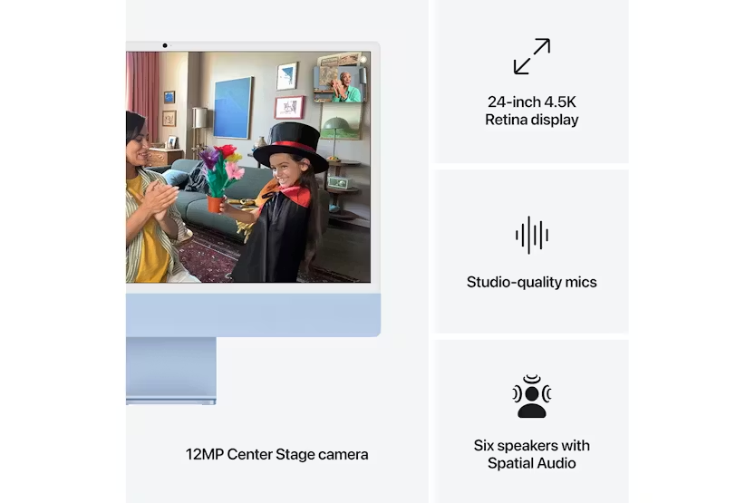Description Key Feature Bullets (with Apple Intelligence) Fits Perfectly in Your Space The all-in-one desktop design is strikingly thin, comes in seven vibrant colours and elevates any space with style. Built for Apple Intelligence [1] Apple Intelligence is the personal intelligence system that helps you write, express yourself and get things done effortlessly. With groundbreaking privacy protections, it gives you peace of mind that no one else can access your data - not even Apple. Supercharged by M4 Get more done faster with the Apple M4 chip. From editing photos to creating presentations to gaming, you’ll fly through work and play. Immersive Display The 24-inch 4.5K Retina display [2] features 500 nits of brightness and supports up to one billion colours. Advanced Camera and Audio Stay perfectly framed and sound great with a 12MP Center Stage camera, three studio-quality mics and six speakers with Spatial Audio. Apps Fly with Apple Silicon [3] All your favourites, including Microsoft Excel, Adobe Photoshop and Zoom, run lightning fast in macOS. If You Love iPhone, You’ll Love Mac Mac works like magic with your other Apple devices. Copy something on iPhone and paste it on Mac. Send texts with Messages or use your Mac to make and answer FaceTime calls. [4] Connect it All iMac features up to four Thunderbolt 4 ports — expanding your accessory options and enabling lightning-fast data transfers. Connect up to two external 6K displays for a vast canvas to view your work. And enjoy seamless connectivity with Wi-Fi 6E and Bluetooth 5.3. [5] Privacy and Security are Built Right in Every Mac comes with robust defences against viruses and malware. If your Mac is lost or stolen, Find My can help you get it back. FileVault makes sure your files are encrypted so others cannot access them. And free security updates help keep your Mac protected. Legal (with Apple Intelligence) Configurable options are available. iMac colour availability may vary. Nano-texture availability may vary. 1. Apple Intelligence is available in beta on all Mac models with M1 and later, with Siri and device language set to US English, as a macOS Sequoia update. English (Australia, Canada, New Zealand, South Africa, UK) language support available this December. Some features and support for additional languages, like Chinese, English (India, Singapore), French, German, Italian, Japanese, Korean, Portuguese, Spanish, Vietnamese and others, will be coming over the course of the next year. 2. Actual diagonal screen size is 23.5 inches. 3. Apps are available on the App Store. Software and content may be sold separately. Title availability is subject to change. 4. FaceTime is not available in all countries or regions. 5. Wi‑Fi 6E available in countries and regions where supported. Technical Specifications Go to apple.com/ie/imac for a complete set.