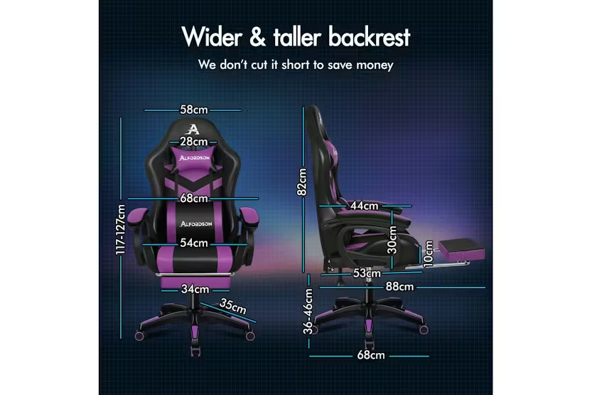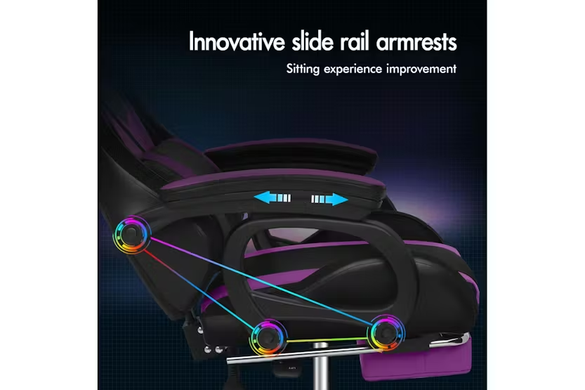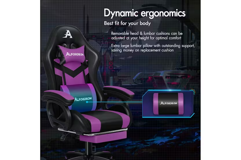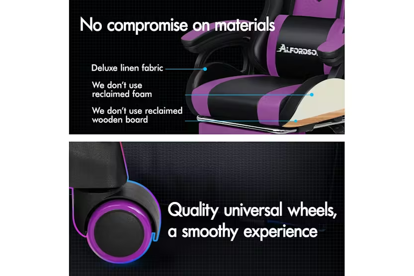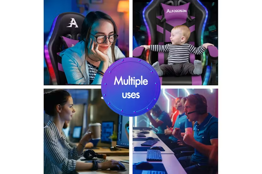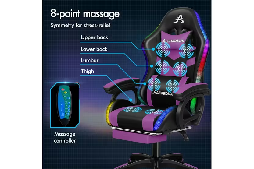Description Online Only - Free Delivery Alfordson LED Gaming Chair | Gaming Seat | PU Leather | Purple Transform your gaming setup and office space with the Alfordson LED Gaming Chair, a premium choice for gamers and professionals across Ireland. Designed by ALFORDSON, this ergonomic gaming seat combines cutting-edge technology, comfort, and style to deliver an unrivalled experience whether you are deep into a gaming marathon or powering through a busy workday. Stand out from the crowd with customisable RGB LED lighting, offering 12 vibrant colours and 300 dynamic lighting effects. Effortlessly control your chair's illumination with the included remote, and choose to light up just the backrest or both the backrest and seat for a truly immersive atmosphere. The Alfordson LED Gaming Chair is more than just a statement piece—it is engineered for performance and wellbeing. Enjoy the ultimate in relaxation with the integrated 8-point massage system, featuring five massage modes to target tension and fatigue. The ergonomic S-curve design, paired with removable and height-adjustable lumbar and headrest cushions, ensures optimal support for your back and neck. The extra-large lumbar pillow and high-resilience, car-seat grade foam padding eliminate pressure on your back and shoulders, letting you stay comfortable for hours on end. Personalise your comfort with a 150-degree reclining backrest, lockable in your preferred position, and a retractable padded footrest for those moments when you need to stretch out. The chair's heavy-duty all-metal frame, premium PU leather upholstery, and triple-layer seat construction guarantee durability and easy maintenance. With a high weight capacity of up to 180kg, this chair is built to last and support users of all sizes. Move freely with the smooth 360-degree swivel and TUV-certified caster wheels, while the deluxe tilt adjustment and wide, padded armrests provide additional flexibility and support. The sporty nylon base, finished with a touch of matching purple, adds a stylish edge to any gaming room or office. Whether you are a dedicated gamer or a busy professional, the Alfordson LED Gaming Chair is the perfect blend of innovation, comfort, and style for Irish homes and offices. Elevate your workspace or gaming arena and experience the difference today. Key Features: Customisable 12-colour RGB LED lighting with 300 effects and remote control 8-point massage system with 5 modes and dedicated controller Ergonomic S-curve design with removable, height-adjustable lumbar and headrest cushions 150-degree reclining backrest with lock function Retractable padded footrest for added comfort Premium PU leather upholstery and high-resilience foam padding Heavy-duty all-metal frame and triple-layer seat construction 360-degree swivel and deluxe tilt adjustment Sporty nylon base with TUV-certified caster wheels High weight capacity: 180kg Ideal for gaming and office use Specifications: Material: Intertek approved supreme PU leather Frame: All-metal construction Colour: Purple Weight Capacity: 180kg Gas-Lift: SGS approved Wheels: TUV approved caster wheels Seat: Triple-layer (PU leather, resilience foam, robust wooden board) Included Items: 1 x Alfordson LED Gaming Chair 1 x Assembly Manual