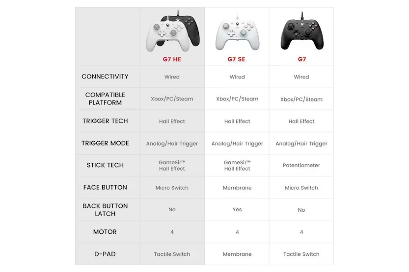 Description GameSir G7 HE Enhanced wired controller for xbox. Xbox series X/S Xbox one X/s Windows 10/11 Steam GameSir Hall Effect Sticks Up to 5 million cycles Anti-drift Hall Effect Analog Triggers Accuracy Up to 0.1mm. Magnetic Swappable Faceplate Warm snow faceplate not included. Advanced Features Micro switch face buttons Anti-friction rings Rubber-coated textured grips 3.5mm headphone jack Product Features: GameSir hall effect stick & hall effect magnetic trigger 1.3 million lifespan face buttons Hyper-realistic rumble motors Magnetic swappable faceplate with painting support 3.5mm headphone jack and microphone mute button 2 Remapping Back Buttons: Widely support remapping functions with almost every button on the controller, adding more control options to your gaming Working platform: Xbox series X|S, Xbox one X|S, steam and windows 10/11 Connection: wired, 3m detachable USB-C cable Micro switch buttons: yes, abxy Analog triggers: yes, hall effect magnetic sensors Hall effect sticks: yes, GameSir Toggle trigger modes Fully Software-customizable Realistic & immersive rumble motors Rumble motors: yes, 4 in total, in each grip and trigger Customization software: yes, GameSir nexus