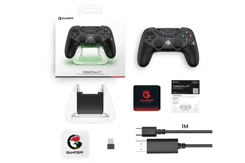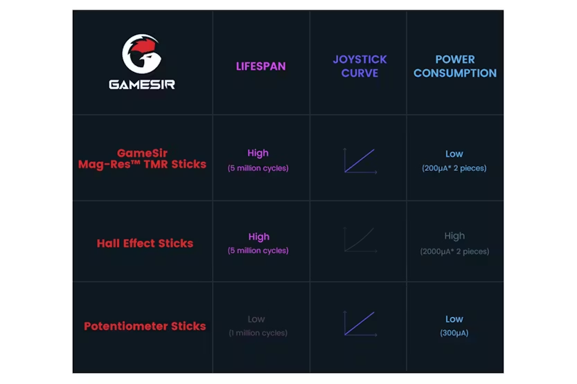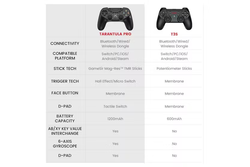 Description GameSir Tarantula Pro Pro by name, Pro by nature. TMR sticks Hall effect micro switch Swappable layout 9 mappable buttons NFC 6-axis gyro RGB lighting HD rumble Universal compatibility PC Switch IOS Android GameSir Mag-restm Tmr Sticks Linear output and high precision comparable to potentiometer sticks ultra-durability and longevity comparable to hall effect sticks. polling rate: 1000Hz Industrial-grade ADC chip: 12bit High-durability: 5M Joystick sampling resolution: 4096 GameSir mag-res TMR sticks - 12bit Traditional potentiometer sticks - 8bit Traditional hall effect sticks - 8bit Seamless Switch Micro switch hall effect. Toggle Trigger Modes Hall effect hair trigger mode: For FPS games Hall effect Analog trigger mode: For racing games Micro switch hair trigger mode: For FPS games Face Buttons Layout Interchangeable via gear mechanism. 9 Μappable Buttons Tailor every move to your unique style. Perfect Choice for Nintendo Fans NFC function Built-in 6-AXIS Gyro One-press wake-up Customizable RGB Lighting Effect Home indicator Lighting strips Abxy buttons Ultra-transparent Acrylic Charging Station Smart auto start-stop Pick up to play Place to charge Full Customization Via GameSir connect software & GameSir app. Advanced Features Two quick-latch retractable back buttons HD rumble motors Cushioned membrane abxy buttons Tactile micro switch D-pad 1200mah Battery Reliable power, enduring performance. Product Features: Tri-mode connectivity Multi-platform compatibility Precise and durable: elevate your gameplay with GameSir tech HD rumble for realistic and immersive haptic feedback Gyroscope and NFC highly support switch Fully customization for diverse gaming habits Software customization: tailor the controller to your need Connection: Wired, Bluetooth, Wireless dongle Sticks: GameSir mag-res TMR sticks Triggers: hall effect or micro switch 6-axis gyroscope Motors: HD rumble Toggle trigger modes ABXY buttons: Membrane Back buttons: yes, 2 back buttons Mappable buttons: 9 buttons in total Customization software: GameSir connect and GameSir app
