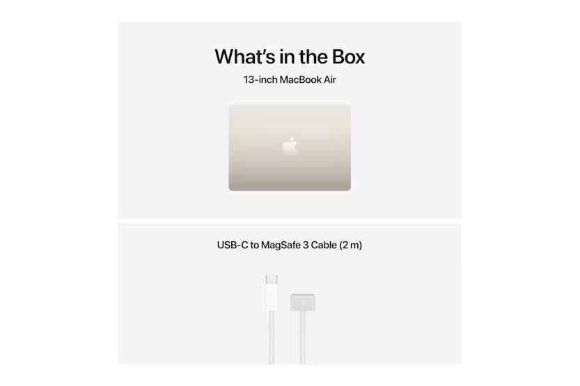 Description MacBook Air 13-inch (M5) Advertisement MacBook Air 13″. Might takes flight. MacBook Air 13″. Supercharged by M5. MacBook Air with the M5 chip brings blazing speed and powerful AI capabilities into an incredibly portable design. With Apple Intelligence, 1 up to 18 hours of battery life 2 and fast SSD storage starting with 512GB, you can work, create and play anywhere life takes you. SUPERCHARGED BY M5 — With its faster CPU and unified memory, M5 delivers even more performance and fluidity across apps, making multitasking and creative workflows smooth and responsive. A powerful Neural Engine and next‑generation GPU with Neural Accelerators give you a powerful platform for AI. APPLE INTELLIGENCE — Apple Intelligence is the personal intelligence system that helps you write, express yourself and get things done effortlessly. With groundbreaking privacy protections, it gives you peace of mind that no one else can access your data — not even Apple. 1 UP TO 18 HOURS OF BATTERY LIFE — MacBook Air delivers incredible battery life with amazing performance, so you can power through a full day of work or class without worrying about plugging in. 2 A BRILLIANT 13.6‑INCH DISPLAY — The Liquid Retina display supports one billion colours. Photos and videos pop with rich contrast and sharp detail, and text appears super crisp. 3 12MP CENTER STAGE CAMERA — Automatically stay in frame during video calls with Centre Stage, or share a top‑down view of your workspace with Desk View. With a three‑mic array and four‑speaker sound system with Spatial Audio and Dolby Atmos, everything sounds great. CONNECT IT ALL — MacBook Air features two Thunderbolt 4 ports, a MagSafe charging port, a headphone jack — as well as the Apple N1 wireless chip for Wi‑Fi 7 4 and Bluetooth 6. It also supports up to two external displays. MACOS RUNS APPS FAST — All your go‑to apps run lightning fast in macOS, including built‑in apps like FaceTime 5 and Messages. Built‑in virus protection and free software updates help keep your Mac running smoothly and securely. IF YOU LOVE IPHONE, YOU’LL LOVE MAC — Mac works like magic with your other Apple devices. Copy something on iPhone and paste it on Mac. Send texts with Messages or use your Mac to make and answer FaceTime calls. 5 POWER ADAPTERS — MacBook Air (13‑inch) includes a USB‑C to MagSafe 3 charging cable, but does not include a power adapter. A USB‑C power adapter or other USB‑PD power source providing 30W or higher is required. For optimal charging, Apple recommends the Apple 30W USB‑C Power Adapter, or the 70W USB‑C Power Adapter for fast charge (up to 50% in 30 minutes). 6 Configurable options are available. 1 Apple Intelligence is available in beta. Some features may not be available in all regions or languages. For feature and language availability and system requirements, see support.apple.com/en‑ie/121115. 2 Testing conducted by Apple in January 2026 using pre‑production 13‑inch MacBook Air systems with Apple M5. Battery life varies by use and configuration. See apple.com/ie/batteries for more information. 3 Screen size is measured diagonally. The display on the 13‑inch MacBook Air has rounded corners at the top. When measured as a standard rectangle, the screen is 13.6 inches diagonally (actual viewable area is less). 4 Wi‑Fi 7 available in countries and regions where supported. 5 FaceTime calling requires a FaceTime‑enabled device for both caller and recipient and a Wi‑Fi connection. 6 Fast‑charge testing conducted by Apple in January 2026 using pre‑production MacBook Air systems with Apple M5. Charge times vary based on environment and settings.