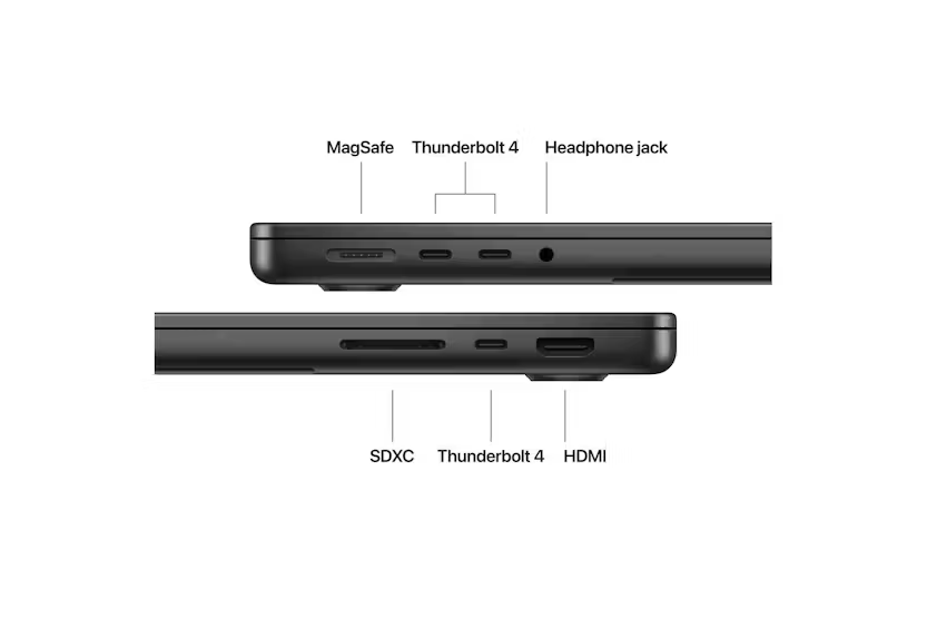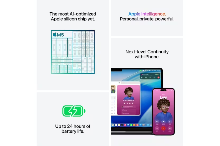 Description MacBook Pro 14″ Supercharged by M5 The 14-inch MacBook Pro with M5 brings next-generation speed and powerful on-device AI to personal, professional, and creative tasks. Featuring up to 24 hours of battery life and a Liquid Retina XDR display. 1 SUPERCHARGED BY M5 — Faster CPU, unified memory, and a powerful GPU with Neural Accelerators built into each core for blazing AI performance. BUILT FOR APPLE INTELLIGENCE — Personal intelligence system that helps you write, express yourself and get things done effortlessly, with privacy protections. 2 UP TO 24 HOURS OF BATTERY — Exceptional performance whether running on battery or plugged in. 1 APPS FLY WITH APPLE SILICON — Microsoft 365, Adobe Creative Cloud and more run lightning fast in macOS. 3 IF YOU LOVE IPHONE, YOU’LL LOVE MAC — Seamless integration with iPhone for copy-paste, Messages, FaceTime and more. 4 BRILLIANT PRO DISPLAY — 14.2-inch Liquid Retina XDR display 5 with 1,600 nits peak brightness, 6 1,000 nits sustained brightness and 1,000,000:1 contrast. ADVANCED CAMERA AND AUDIO — 12MP Center Stage camera, three studio-quality mics, six speakers with Spatial Audio and Dolby Atmos. CONNECT IT ALL — Three Thunderbolt 4 ports, MagSafe 3, SDXC card slot, HDMI, headphone jack. Supports up to two external displays. PRIVACY AND SECURITY BUILT IN — FileVault encryption, Find My tracking, and free security updates to keep your Mac protected. 1 Battery life varies by use and configuration. See apple.com/ie/batteries for more information. 2 Apple Intelligence is available in beta. Some features may not be available in all regions or languages. See support.apple.com/en-ie/121115. 3 Apps are available on the App Store. Software and content may be sold separately. 4 FaceTime is not available in all countries or regions. 5 Display measured as a standard rectangle. Actual viewable area is less. 6 Up to 1,600 nits peak brightness in temperatures less than 25° C.