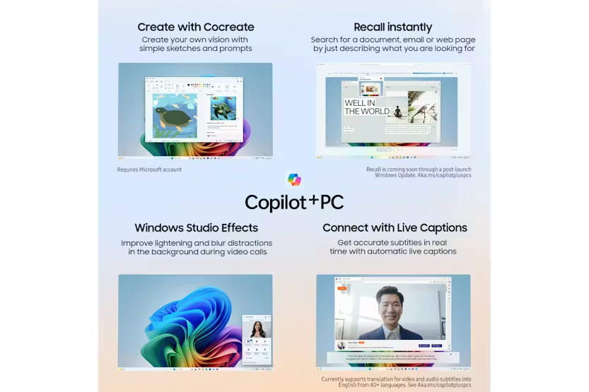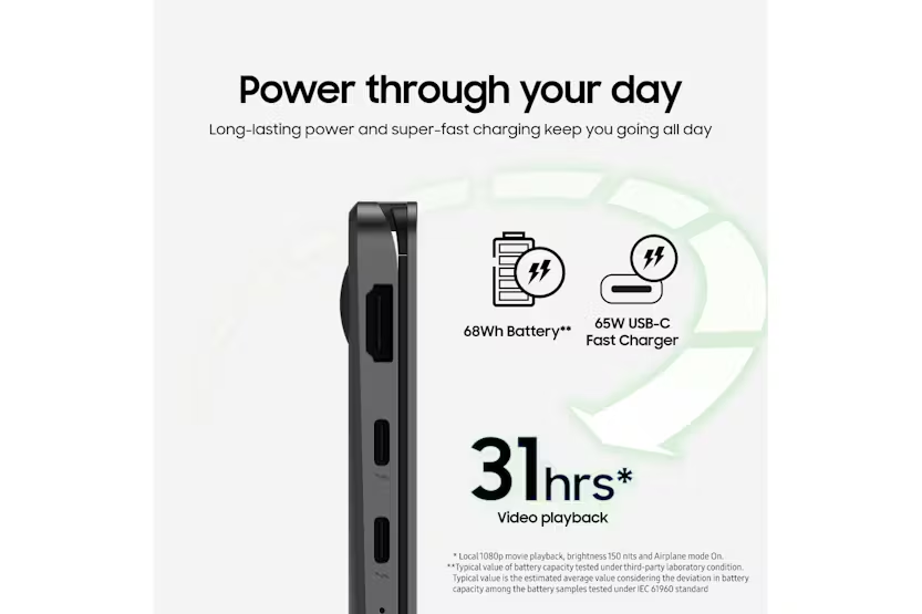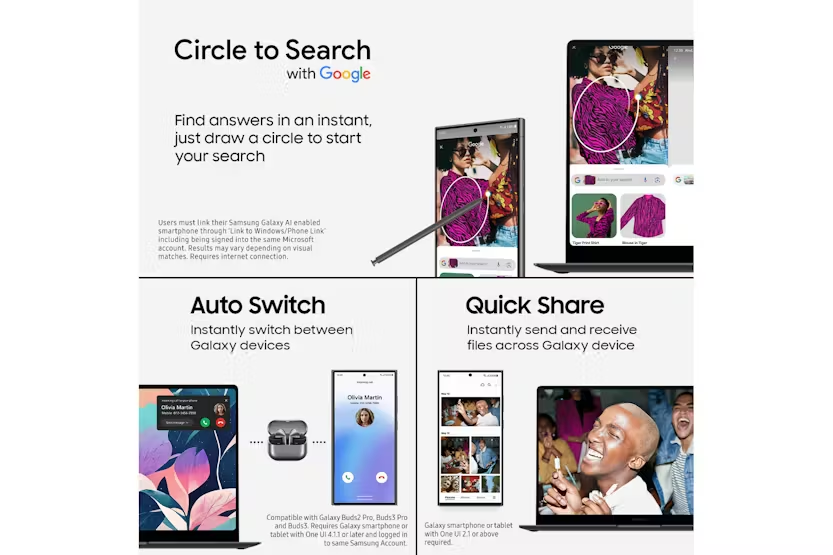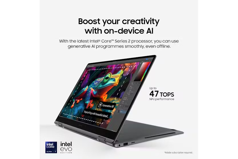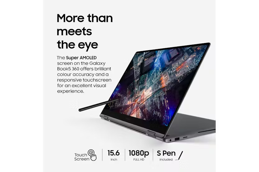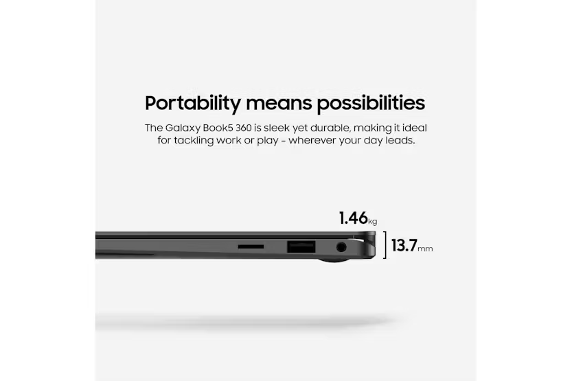 Description Boost Your Creativity with On-Device Al With the latest Intel Core Series 2 processor, you can use generative Al programmes smoothly, even offline. Copilot+PC Create with Cocreate Create your own vision with simple sketches and prompts. Recall Instantly Search for a document, email or web page by just describing what you are looking for. Windows Studio Effects Improve lightening and blur distractions in the background during video calls. Connect with Live Captions Get accurate subtitles in real time with automatic live captions. Power Through Your Day Long-lasting power and super-fast charging keep you going all day. More Than Meets The Eye The Super AMOLED screen on the Galaxy Book5 360 offers brilliant colour accuracy and a responsive touchscreen for an excellent visual experience. Portability Means Possibilities The Galaxy Book5 360 is sleek yet durable, making it ideal for tackling work or play - wherever your day leads. Circle to Search with Google Find answers in an instant, just draw a circle to start your search Users must link their Samsung Galaxy Al enabled smartphone through 'Link to Windows/Phone Link' including being signed into the same Microsoft account. Results may vary depending on visual matches. Requires internet connection. Auto Switch Instantly switch between Galaxy devices Quick Share Instantly send and receive files across Galaxy device Performance: Enhance Your Everyday Creativity, All Day with up to 31 Hours Battery Life Whether itās surfing the web, catching up on emails, or building an unmissable presentation, multitasking is made simple with the Galaxy Book5 360. The new Intel Core Ultra Series 5 processors produces up to 47 TOPs and on-device AI. The powerful NPU offers more efficiency, allowing up to 31 hours battery life*, Itās also Intel Evo-verified, so you get extra speed, performance, and connectivity as standard. Plus, as a Copilot+ PC, you can enjoy on-device AI tools like Cocreate, Recall, Windows Studio Effects and Live Captions. *Local 1080p movie playback, brightness 150 nits and Airplane mode On. Design: As Flexible as You The Galaxy Book5 360 offers incredible flexibility at your fingertips, transforming from laptop to tablet in a few moments. Take notes, sketch and annotate on the Super AMOLED touchscreen with the included S Pen. Encased in aluminium and finished in Grey, itās designed to keep you productive wherever life takes you. Display: More Than Meets the Eye Enjoy rich colour and clarity with the Galaxy Book5 360ās 15.6-inch Super AMOLED touchscreen. With vibrant whites, deep blacks, and quick response times, everything from streaming movies to gaming and checking emails looks fantastic. Plus, the display is SGS Eye Care certified*, reducing harmful blue light to make evening use easier on your eyes. * SGS, the worldās leading certification company, awarded the Galaxy Book Seriesā display the Eye Care Certification based on its ability to drastically reduce the harmful effects of blue light. Portability: Portability Means Possibilities The Galaxy Book5 360 is designed for everyday versatility. Weighing just 1.46kg, itās light enough for easy transport between home and the office and slips comfortably into a backpack. Equipped with Wi-Fi 7*, it ensures secure connections, clearer video calls, and faster browsing. It has all-day battery life, with up to 31 hours*. Plus, with Super-Fast Charging via the 65W USB-C, recharging the powerful 68Wh (typical) battery is quick and hassle-free too. * Requires optimal connection and a Wi-Fi 7 router. Product Features: Ports: 2 x Thunderbolt 4, 1 x USB-A, HDMI, microSD, HP/Mic-in Up to 31 hours on a single charge Powerful processing Transforms in seconds Tactile and stylish Easy on the eye Take it everywhere Stylus: S Pen Audio: Stereo speakers Battery: 68Wh (Typical) Connectivity: 802.11ab (Wi-Fi 7) Security: Fingerprint scanner Read More