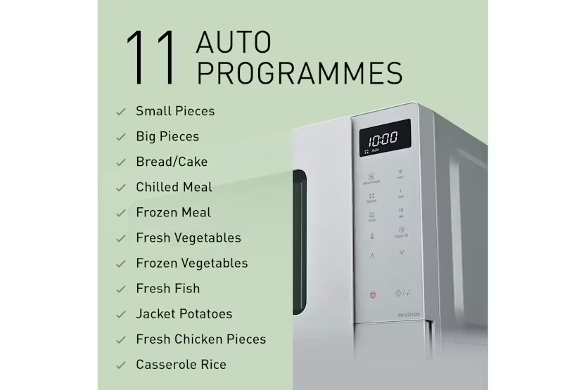 Description Treat your kitchen to an upgrade it deserves with the spanking new PANASONIC MICR20S - NN-ST23QMBPQ 20L Solo Microwave . Renowned for its sleek, minimalistic design, this microwave is not just an appliance, but an enhancement to your kitchen's appeal. This compact - but entirely functional - microwave from the reputable brand, PANASONIC, engrosses itself effortlessly in your kitchen area. With its strikingly uncluttered design, it aligns perfectly with modern Irish homes that value sophistication and cleanliness. This 800W silver microwave is installed with a White LED Backlit Digital Display. Experience absolute clarity with readability even under outright lighting conditions; cooking has never been this flawless. Flexible cooking is assured with 5 different power settings, inclusive of an easy defrost mode at 200W for superior heating precision consistently. Overwhelm your tastebuds with various dishes crafted effortlessly by the choice of 8 automatic programmes. With this PANASONIC microwave, efficiency is the norm. Equipped with auto reheat function and 3 quick defrost modes, this compact gadget never compromises on the food's texture and flavour. It adjusts heat as per the food weight to ensure luscious recipes every time. Distinguishable features of this Silver Microwave Pa include the convenience offered with quick '30-minute power heating' function and 'Add Time' functions. Speed up your cooking by hitting the Quick 30 function for swift 30-second heating or extend heating times instantly with the intuitive 'Add Time' button. Key Features and Specifications: Type: 20L Solo Microwave Brand: PANASONIC Colour: Silver Power Consumption: 800W Defrost Modes: 3 Auto Defrost modes Automatic Programmes: 8 Additional Features: Quick 30, Add Time & Auto Reheat functions Rediscover your passion for cooking with our PANASONIC MICR20S NN-ST23QMBPQ 20L Solo Microwave Pa and take creating scrumptious dishes to a whole new level. This is a prudent choice for Irish households with its integration of function, aesthetics and unparalleled technology. Bring this celebrated compact kitchen appliance from PANASONIC today and revolutionize your culinary experiences.